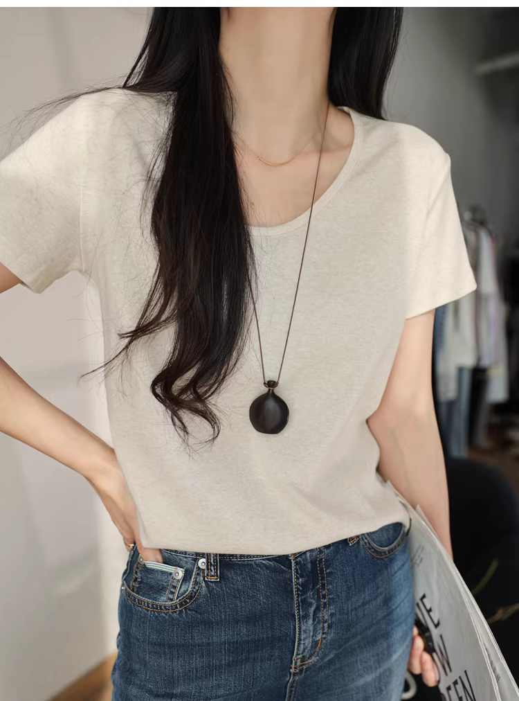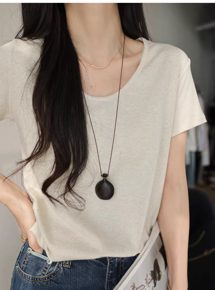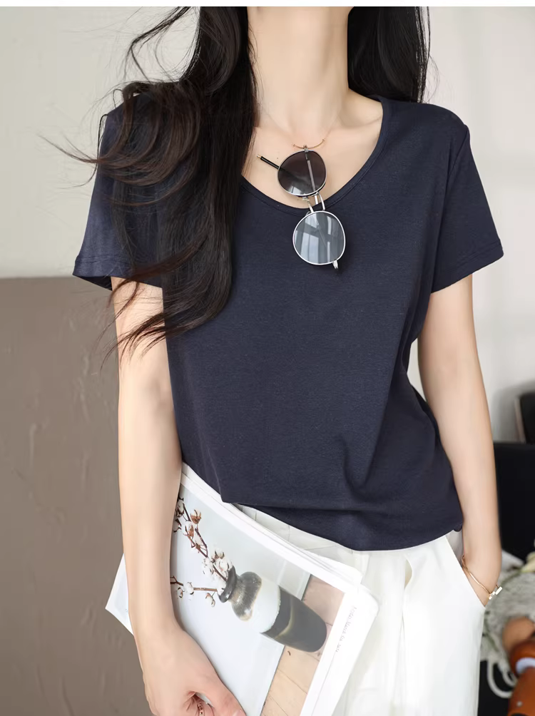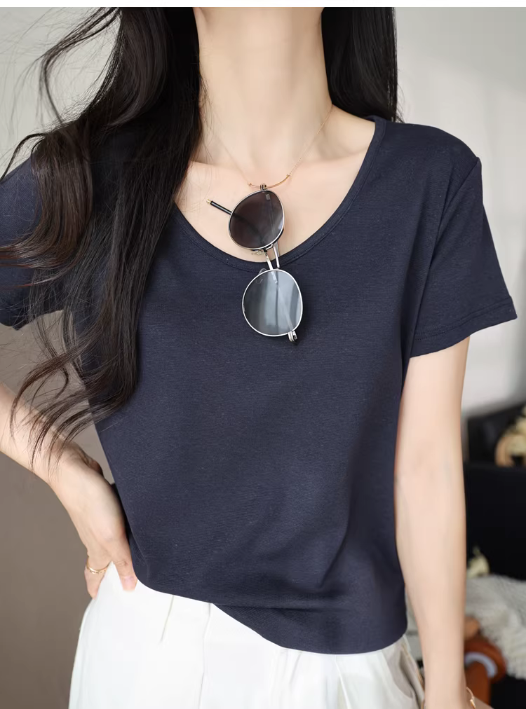Giá trị cao! Nạp thêm vào kho hàng! Áo thun nữ tay ngắn dáng rộng, cổ chữ V, chất liệu vải lanh cotton Lyocell, màu trơn đa năng, thích hợp cho mùa hè.