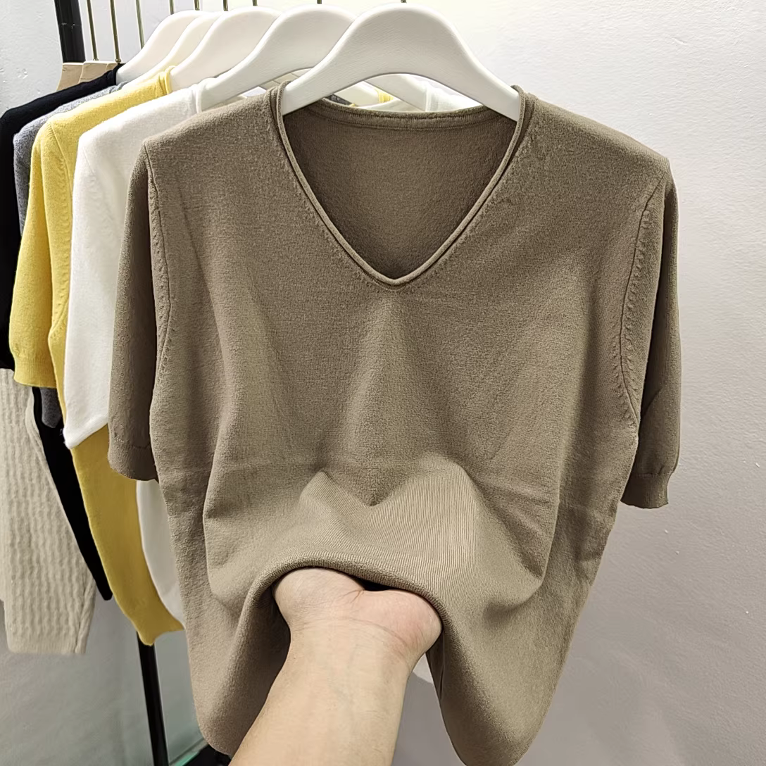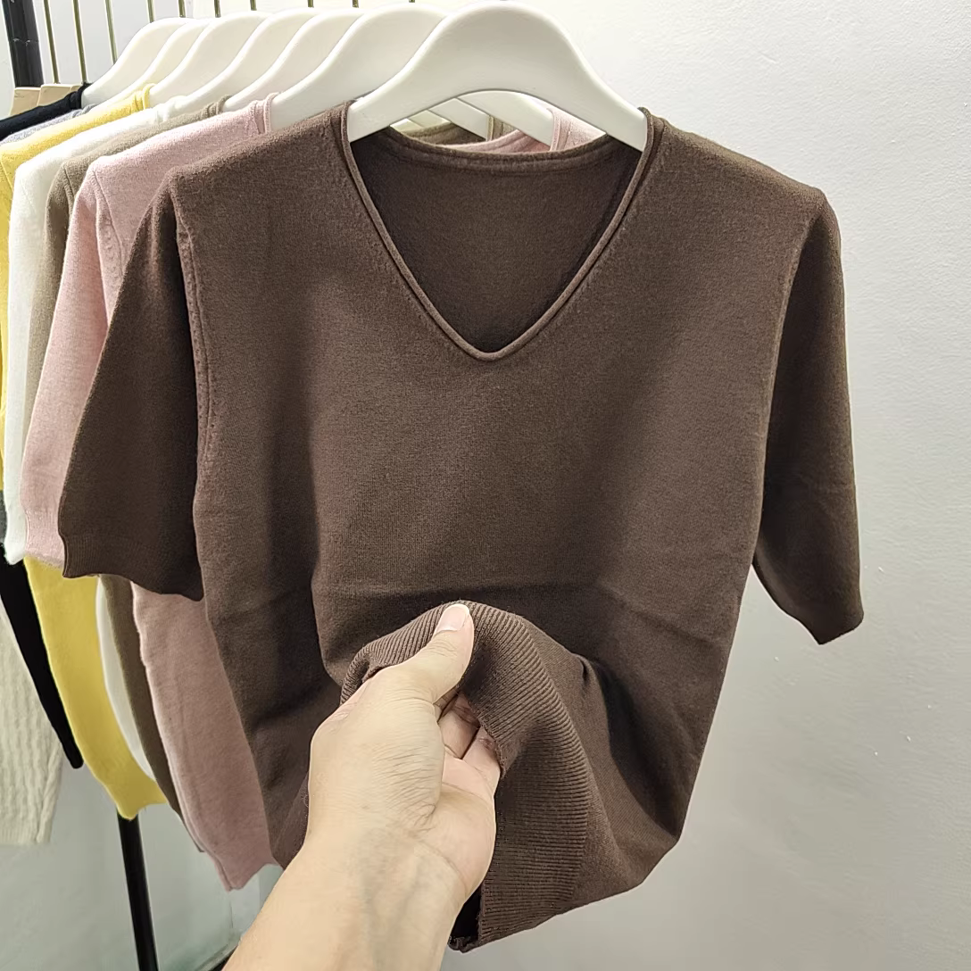 Giảm giá: Quần áo nữ ngoại thương Nanyou, áo thun dệt kim cổ chữ V màu trơn, tay ngắn, xếp lớp, kiểu dáng thời trang và độc đáo.