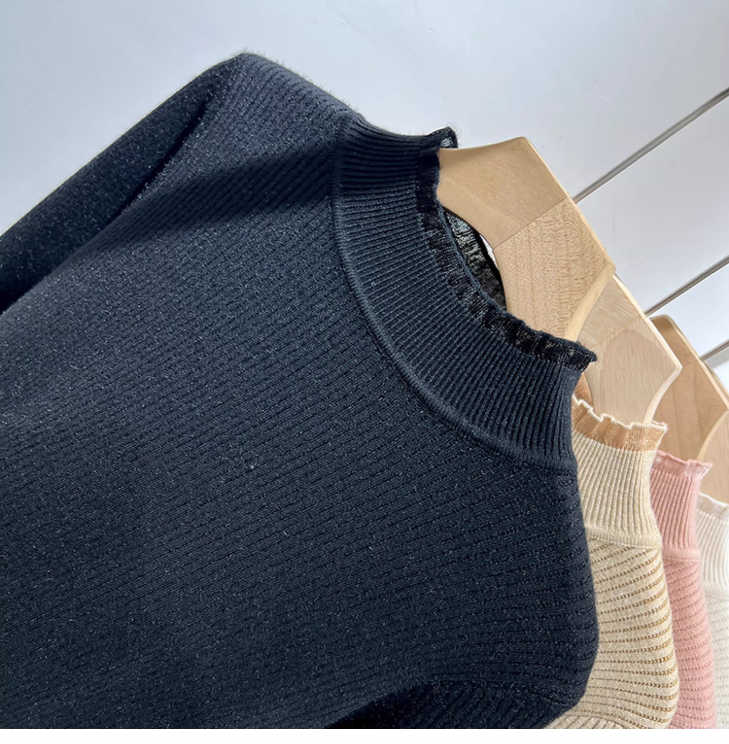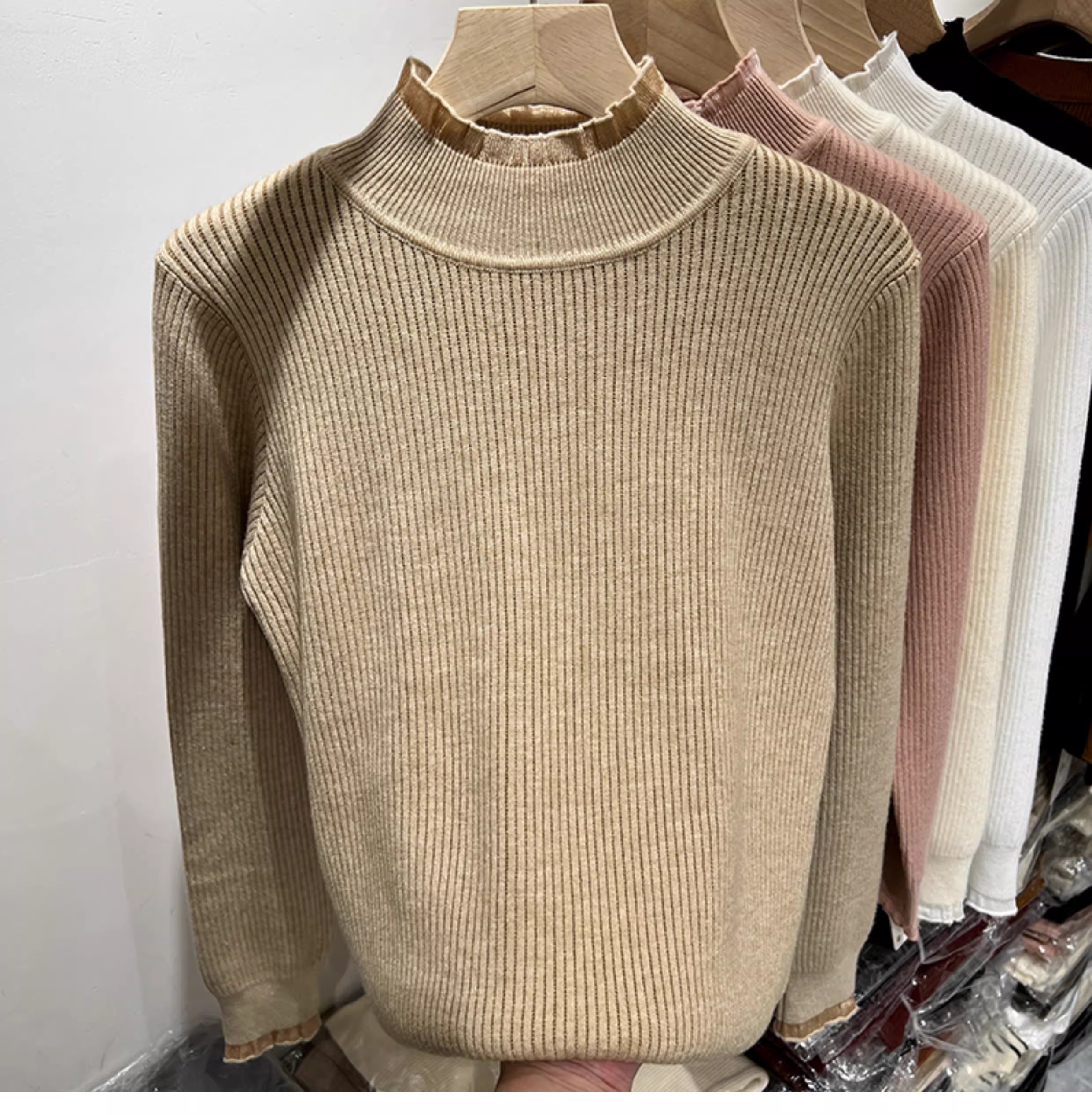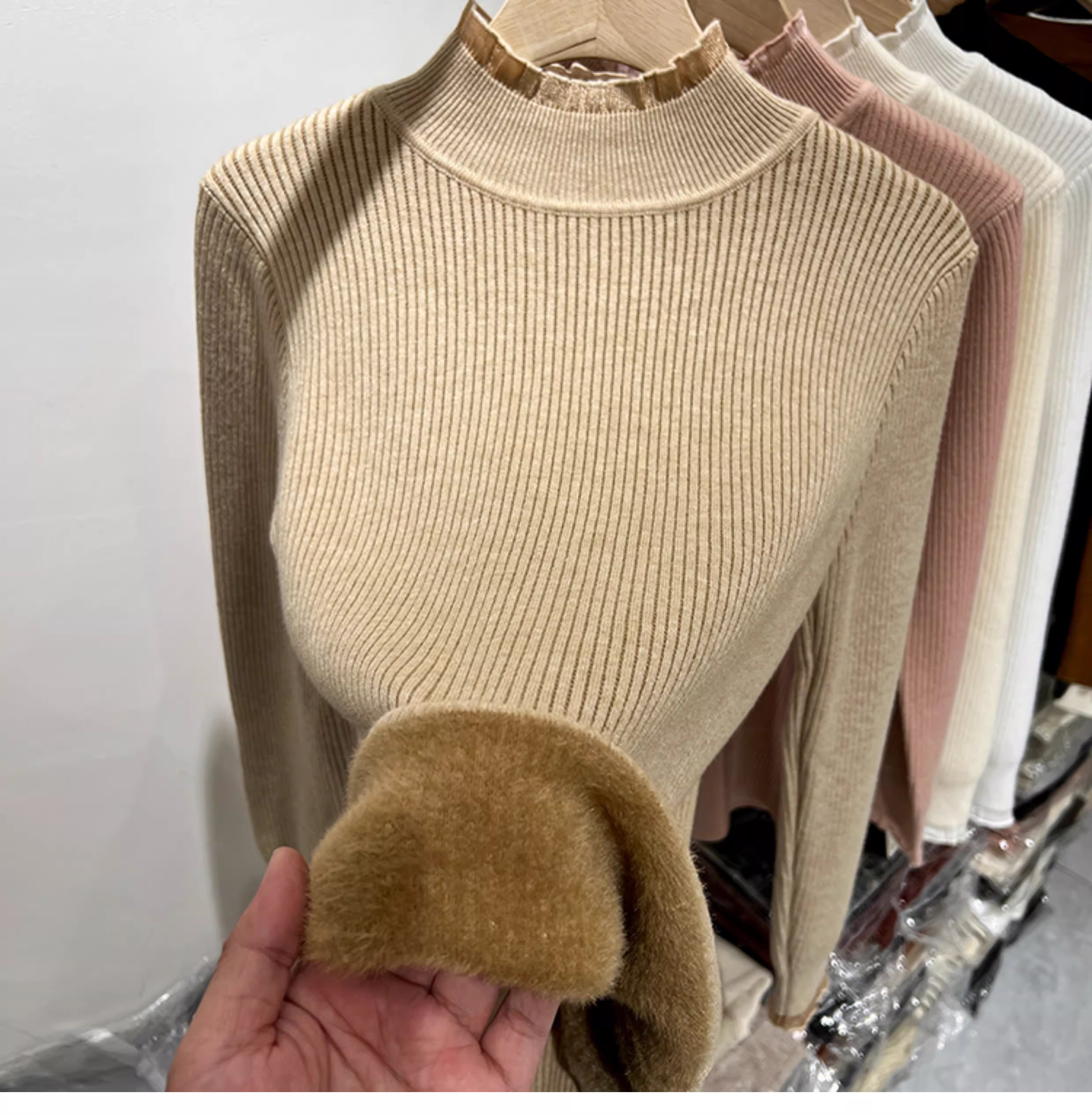 Giảm giá thanh lý quần áo nữ có tag cắt, lót lông cừu, viền ren dày, áo len dệt kim cổ nửa cao, áo dài tay có gân.