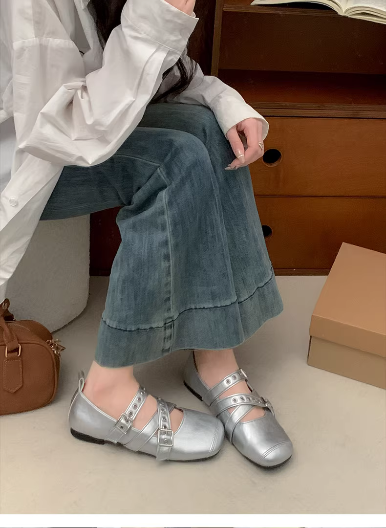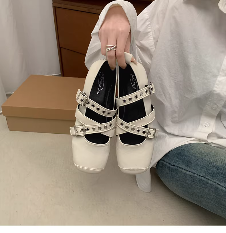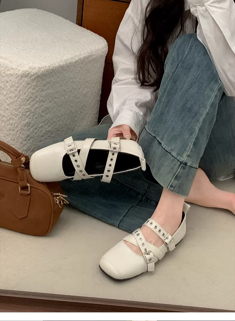 - Giày bệt da nữ Nanzai Nanfang kiểu dáng mới mùa thu 2025, phối chân váy, mũi vuông, kiểu ballet, đế thấp.