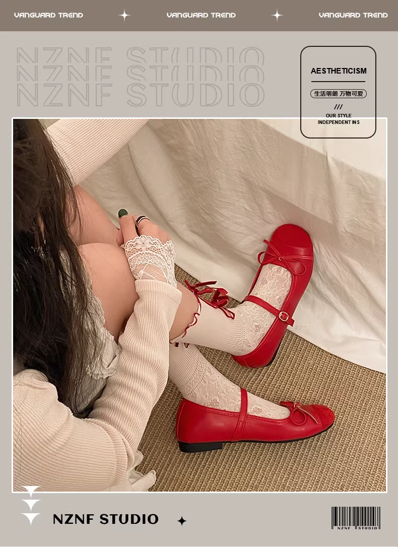 Giày bệt kiểu ballet màu đỏ dành cho nữ, mẫu mới thu 2025, đa năng, mũi tròn, đế mềm, kiểu Mary Jane Pháp