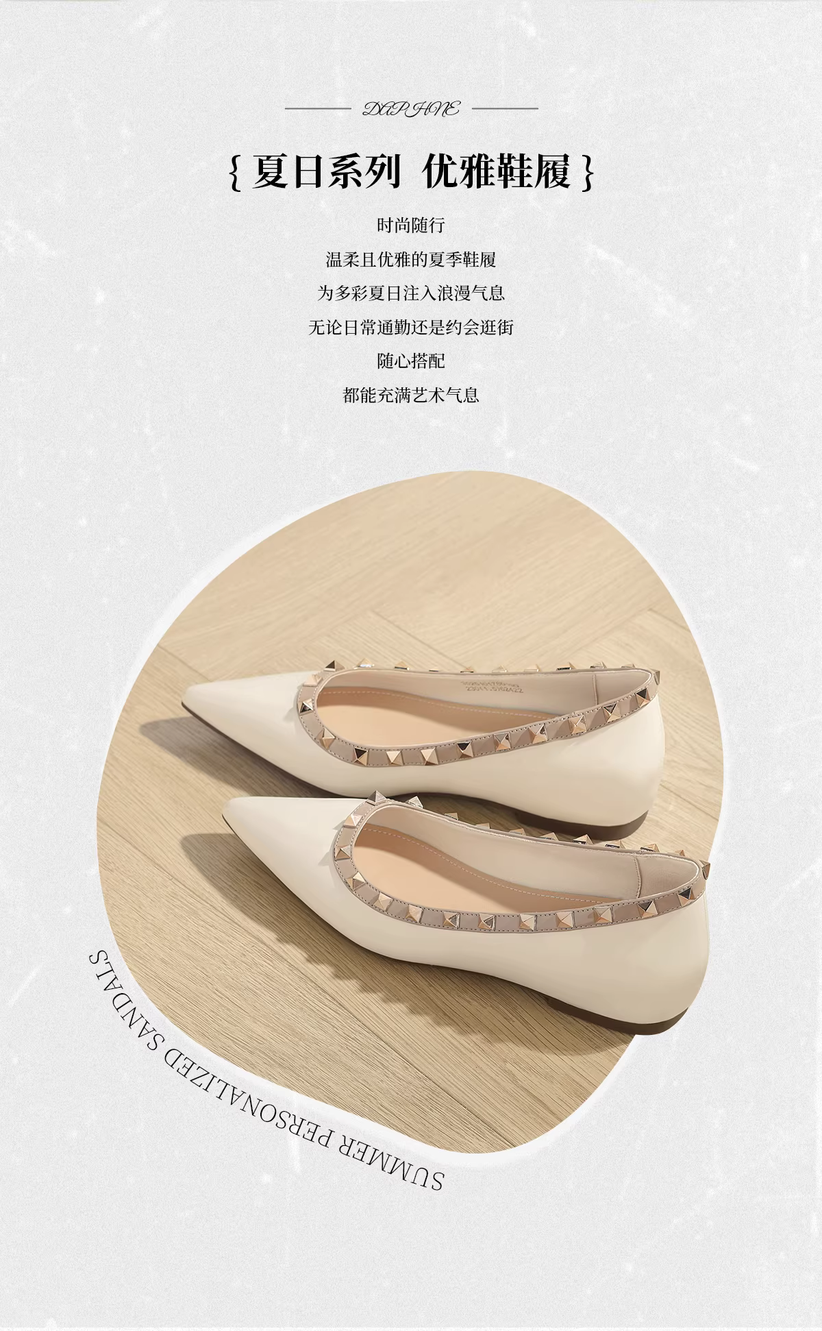 Giày bệt mũi nhọn miệng nông Daphne dành cho nữ, mẫu mới hè 2025, màu nude, đính đinh tán, kiểu Mary Jane Pháp.