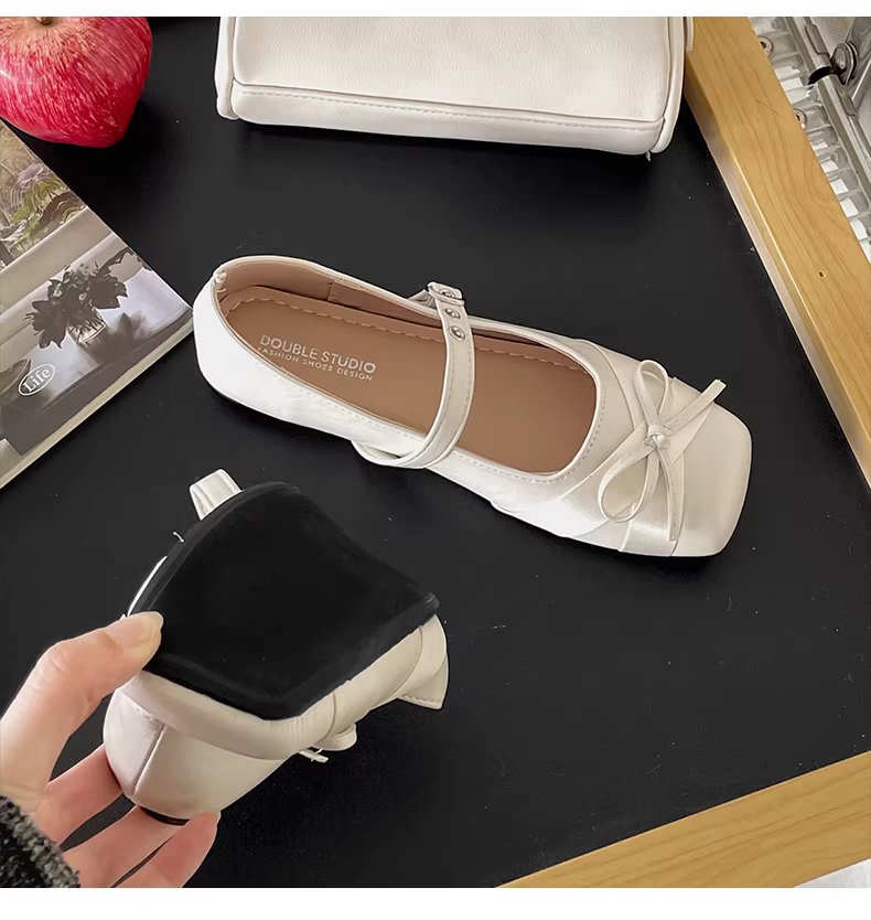 Giày bệt mũi vuông kiểu ballet màu bạc dành cho nữ, mẫu mới thu đông 2025, kiểu Mary Jane cổ điển, phối cùng chân váy