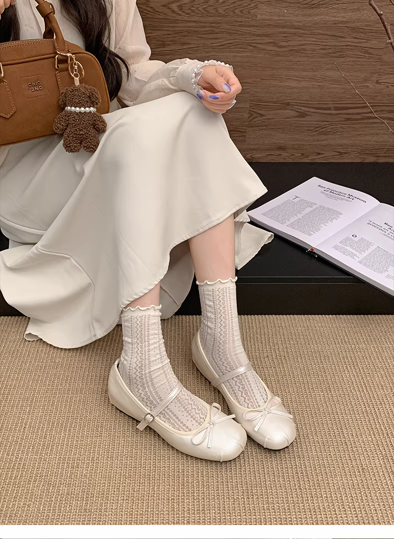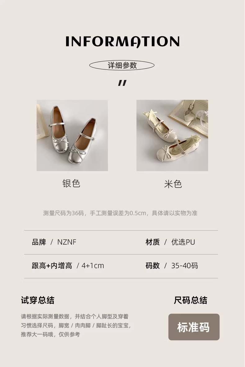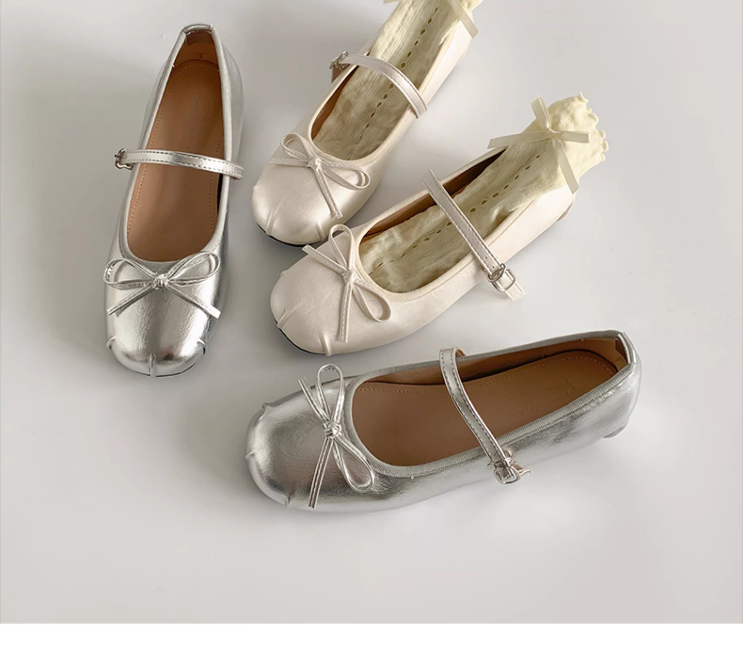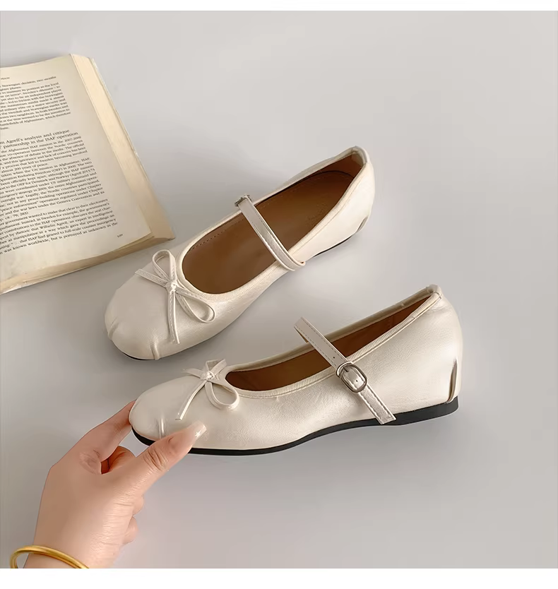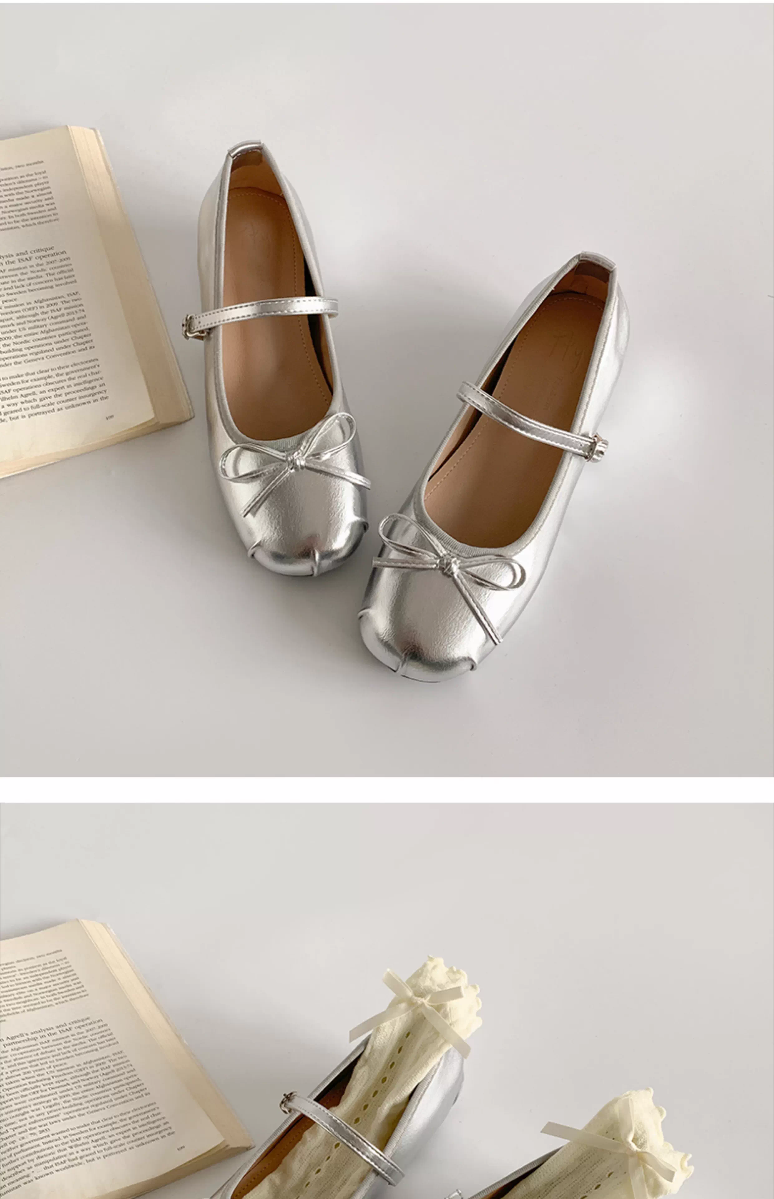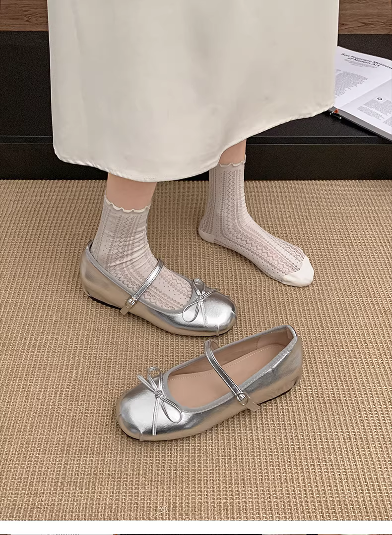 - Giày bệt nữ kiểu Pháp cổ điển màu bạc, mũi tròn, đế thấp, mẫu mới thu 2025, phối chân váy, giày Mary Jane tăng chiều cao.