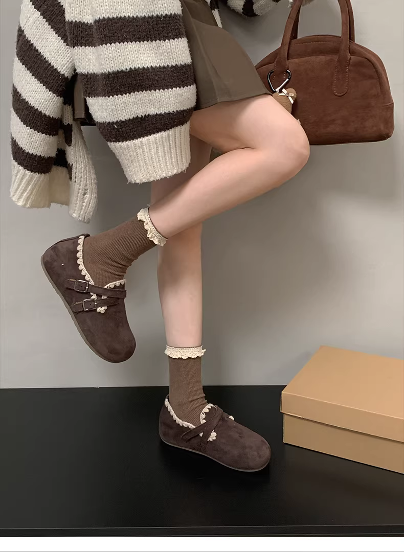 - Giày Birkenstock đế dày cổ điển màu nâu dành cho nữ, kiểu thu đông 2025 mới, phối cùng chân váy, giày lót lông cừu.