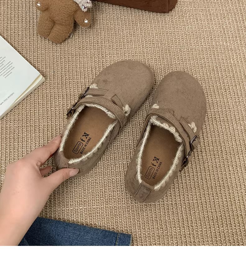 Giày Birkenstock đế dày cổ điển màu nâu dành cho nữ, kiểu thu đông 2025 mới, phối cùng chân váy, giày lót lông cừu.