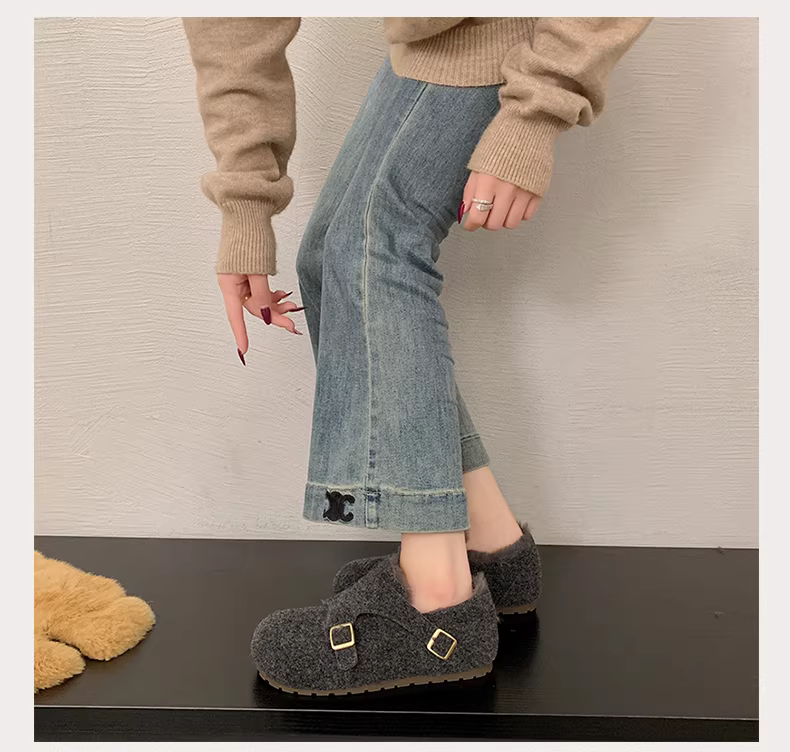 - Giày bông giữ ấm đế dày chống trơn tăng chiều cao kiểu retro dành cho nữ, mẫu mới mùa đông 2025, lót lông cừu, kiểu Birkenstock
