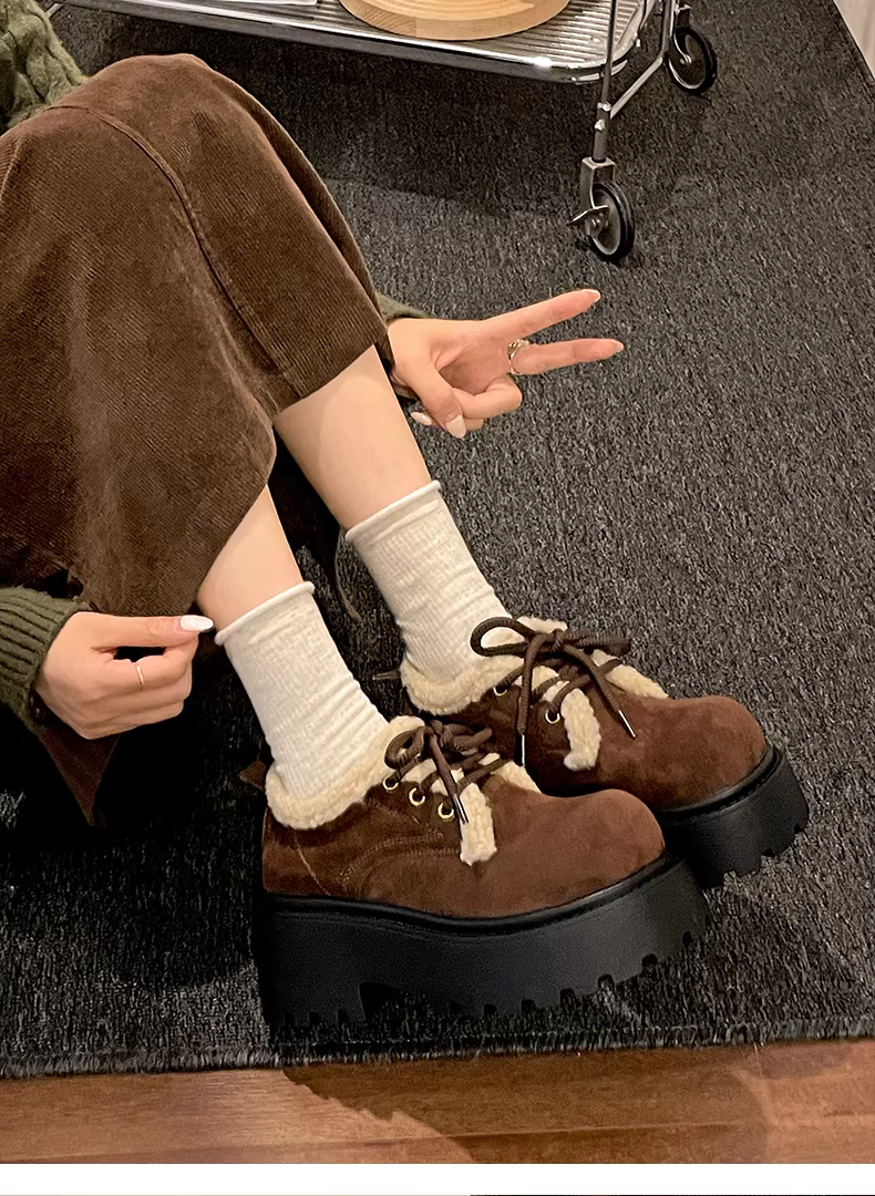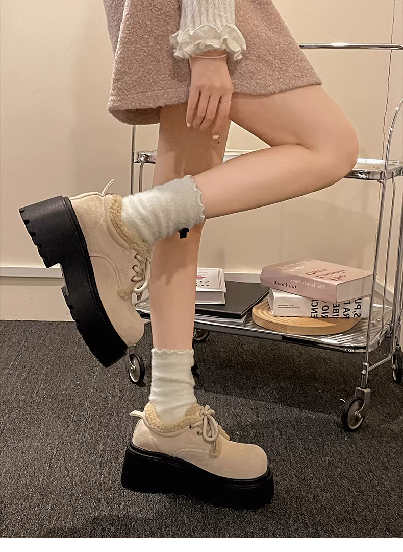 Giày bông tuyết đế dày màu trắng cỡ nhỏ kiểu retro dành cho nữ, kiểu mới mùa đông 2025, lót lông cừu ấm áp và giày lười lông dày