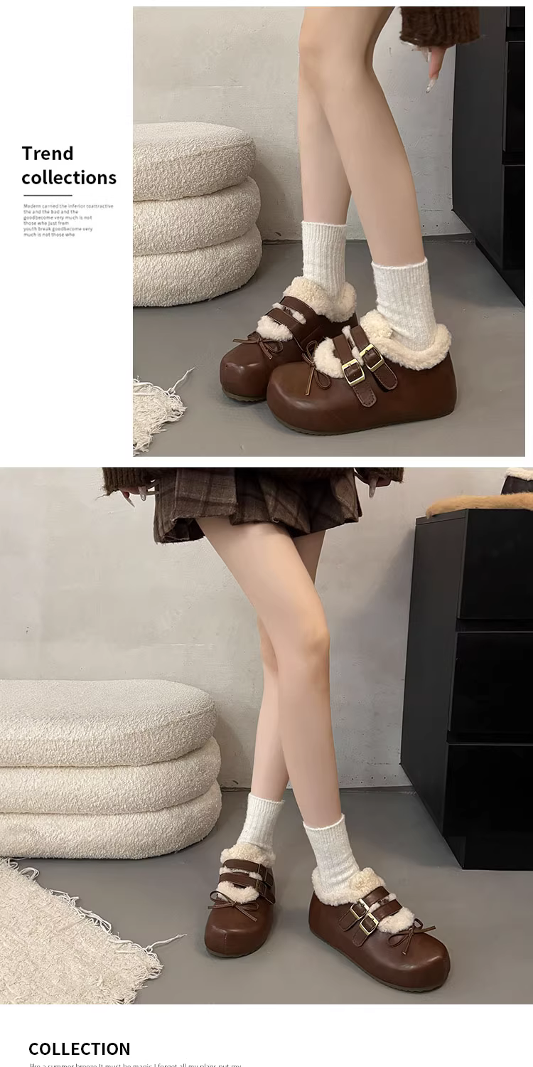 Giày bông tuyết đế dày tăng chiều cao kiểu retro đen dành cho nữ, kiểu mới mùa đông 2025, lót lông cừu, dày dặn, ấm áp, kiểu Birkenstock lông xù.