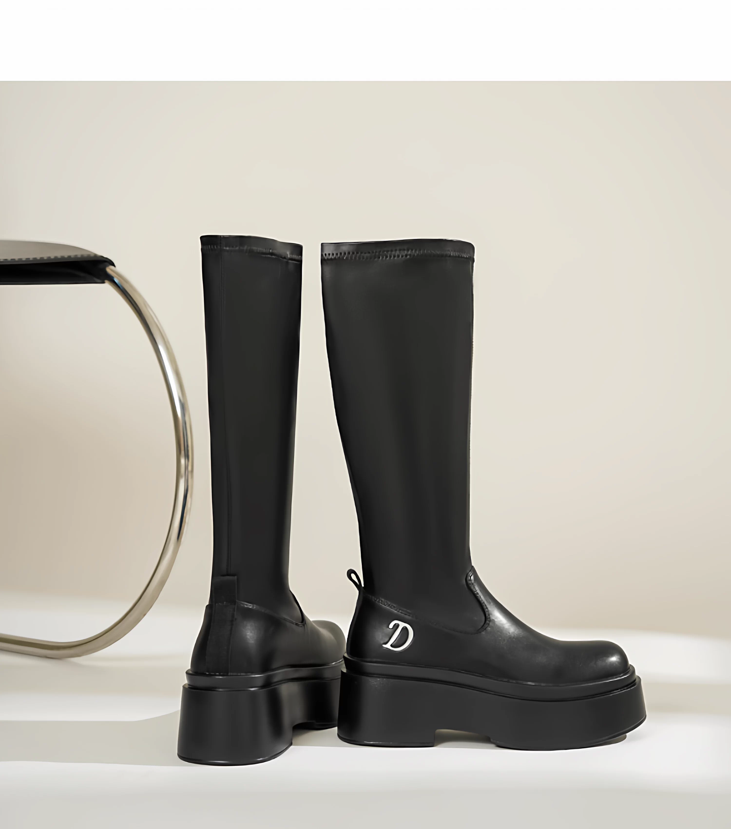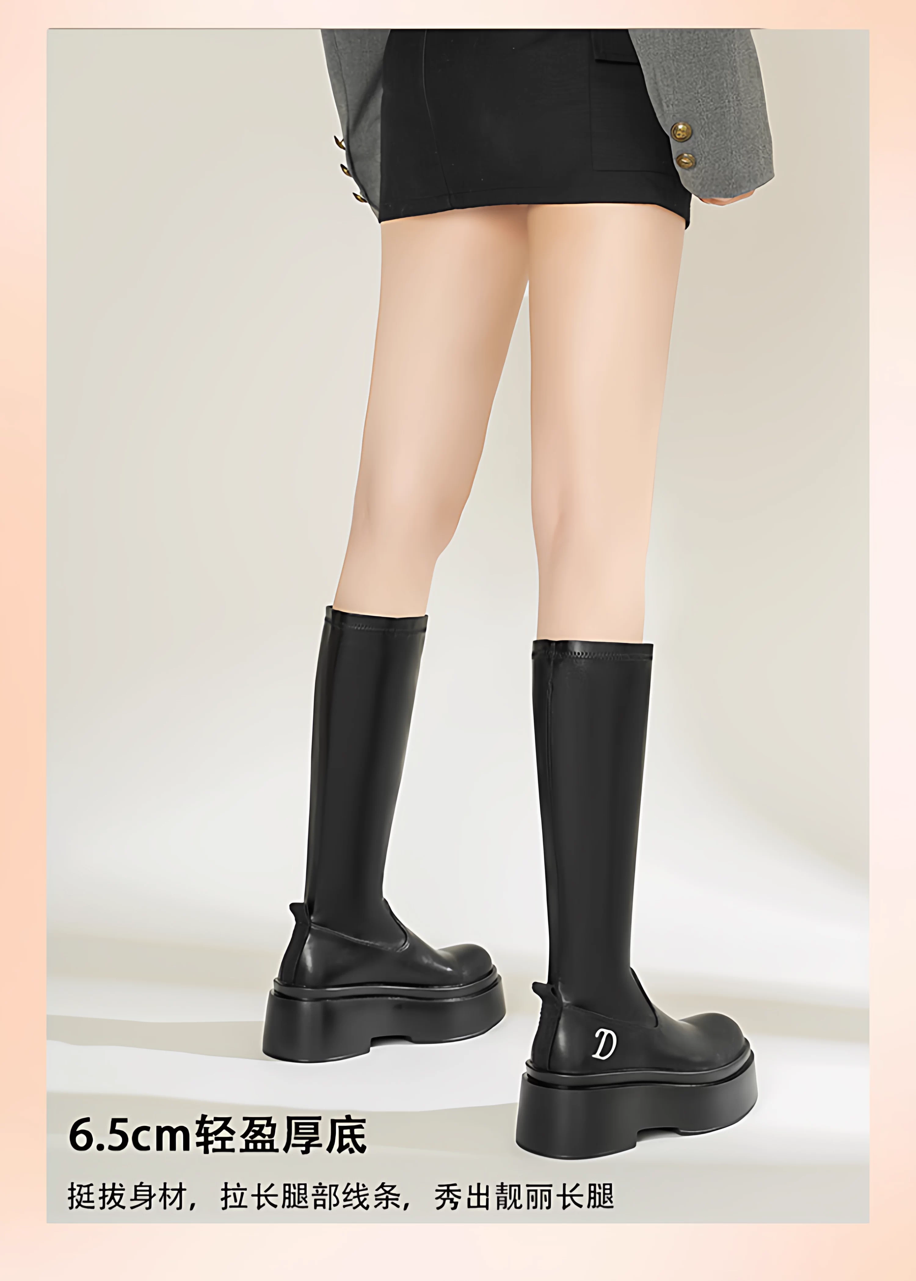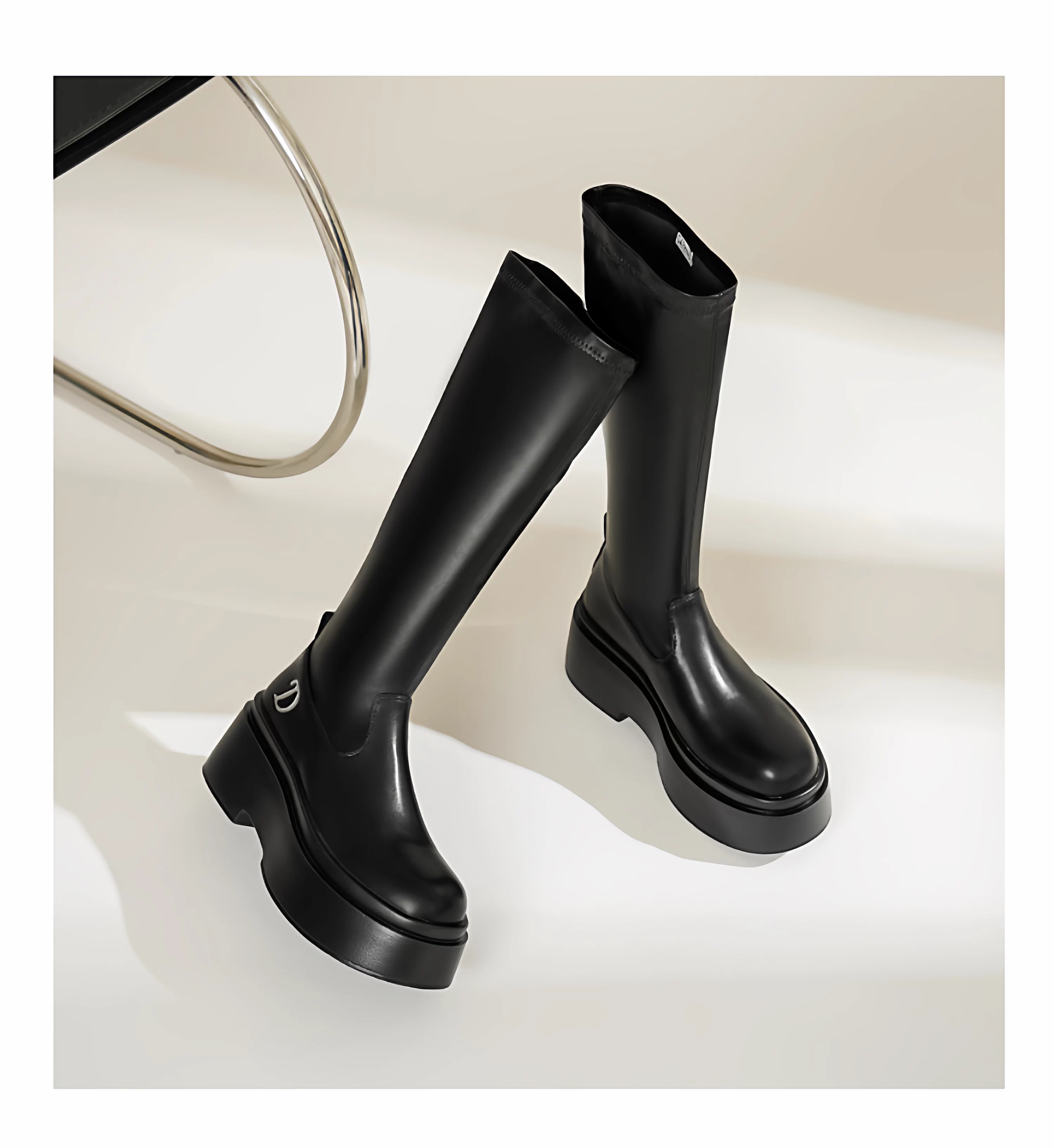 Giày bốt cao cổ đế dày Daphne dành cho nữ 2025, kiểu mới màu đen, chất liệu thun ôm sát, kiểu dáng cao cổ, phong cách hiệp sĩ, giày bốt dài hot girl