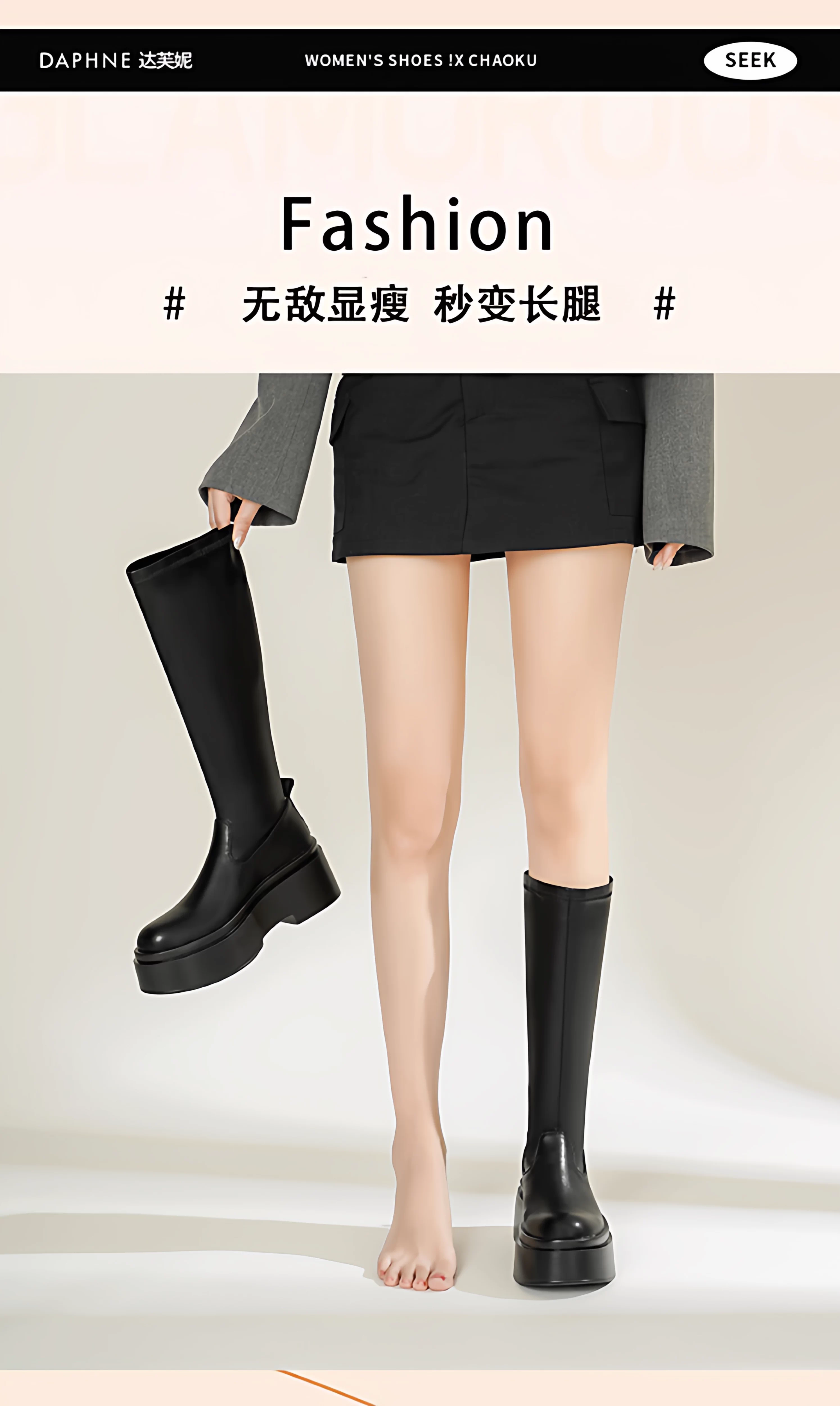 - Giày bốt cao cổ đế dày Daphne dành cho nữ 2025, kiểu mới màu đen, chất liệu thun ôm sát, kiểu dáng cao cổ, phong cách hiệp sĩ, giày bốt dài hot girl