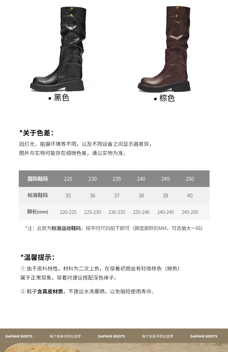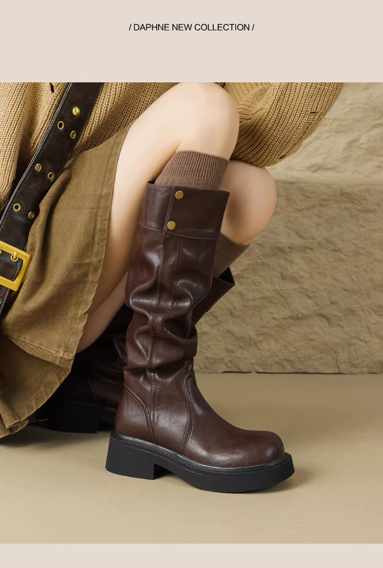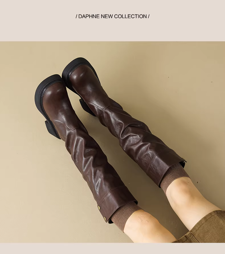 - Giày bốt cao cổ đế dày Daphne dành cho nữ, kiểu mới mùa thu đông 2025, bốt da cao quá gối, bốt da nhiều lớp có lót lông, bốt hiệp sĩ