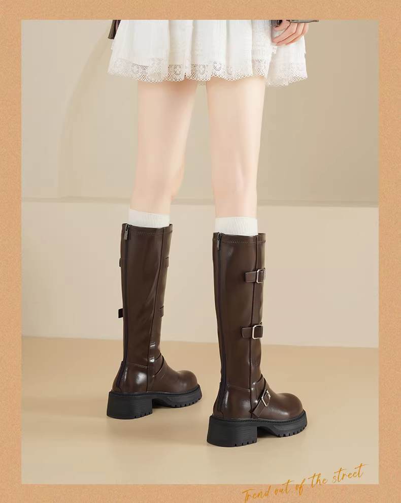 - Giày bốt cao cổ đế dày Daphne dành cho nữ, mẫu mới thu đông 2025, kiểu retro, có khóa thắt lưng, kiểu bốt đi xe máy, ôm dáng, cao cổ.