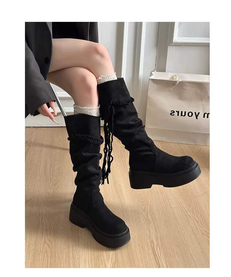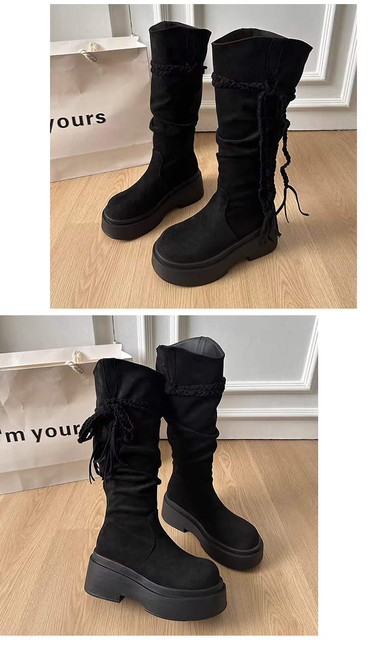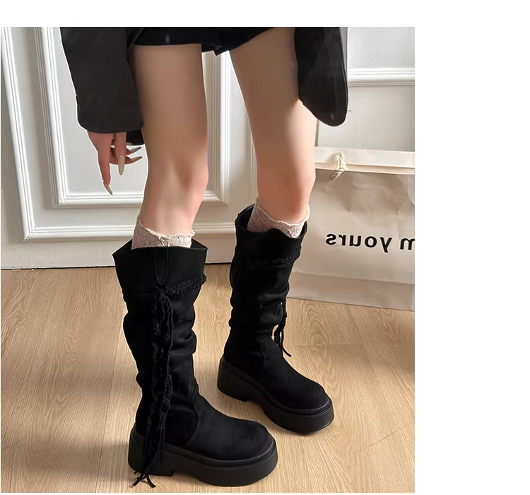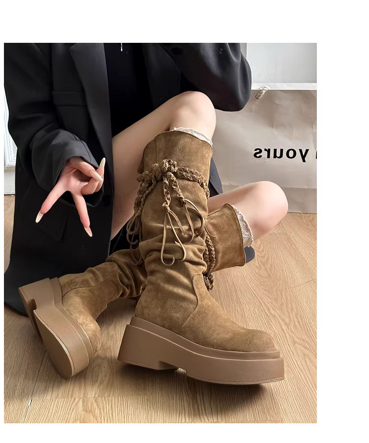 - Giày bốt cao cổ đế dày màu kaki cổ điển dành cho nữ, kiểu dáng mới mùa thu đông 2025, tăng chiều cao, dành cho người nhỏ nhắn
