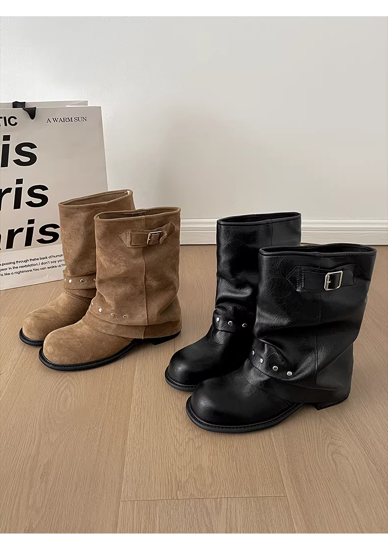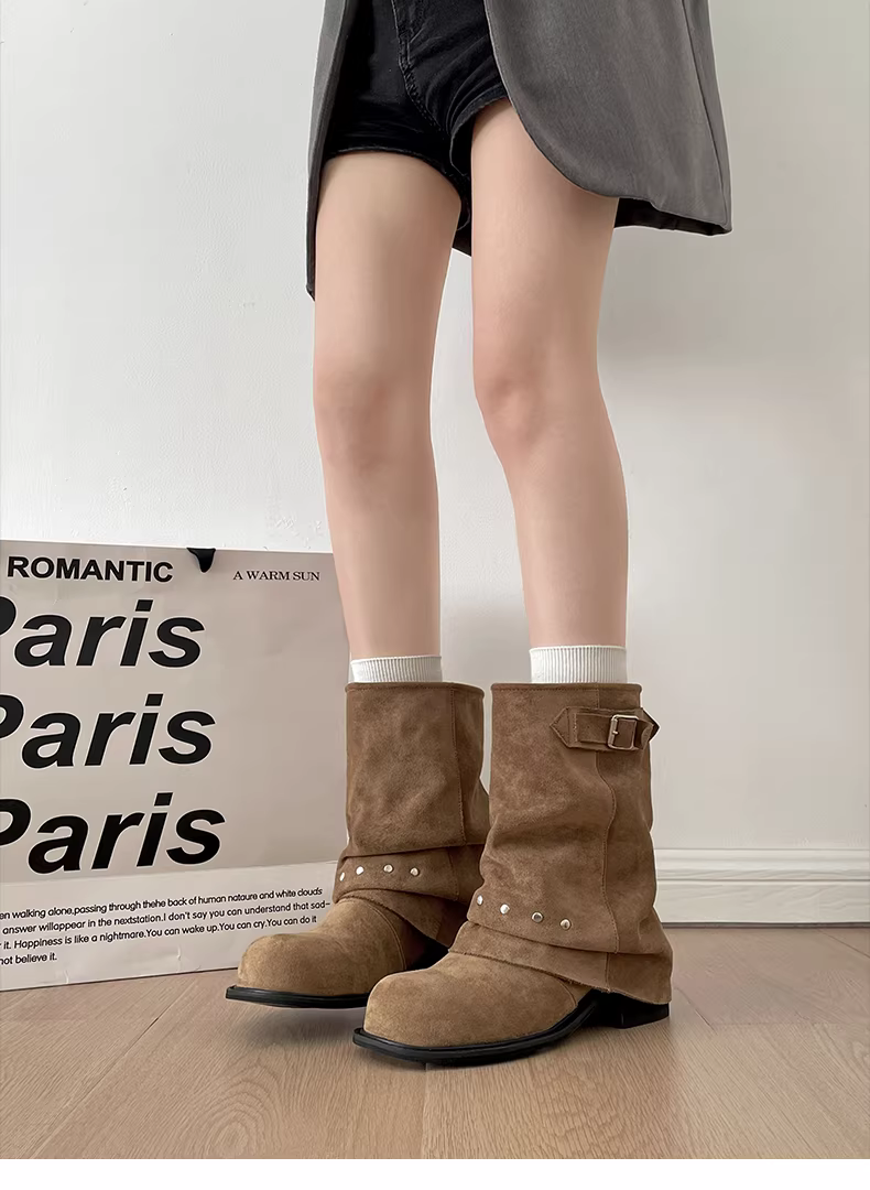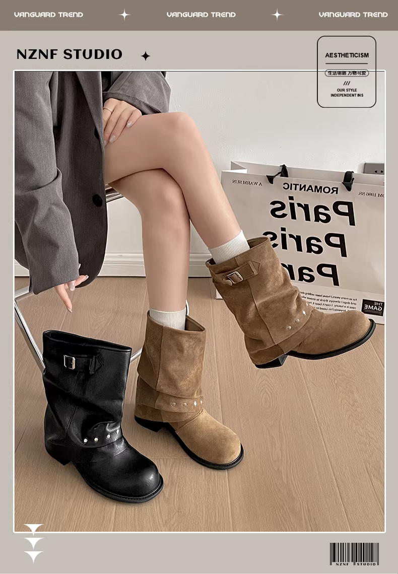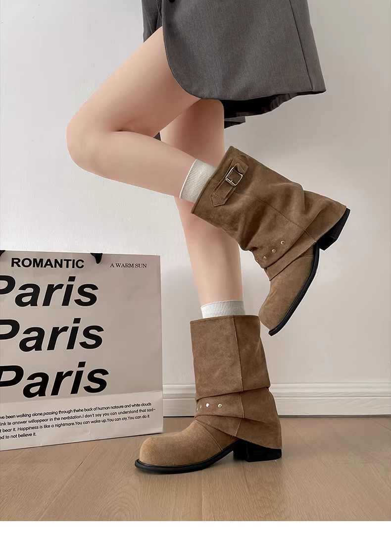 - Giày bốt cao gót chunky cổ điển màu nâu dành cho nữ, kiểu dáng thu đông mới 2025, tăng chiều cao, thon gọn, kiểu dáng quần ống đứng Melard.