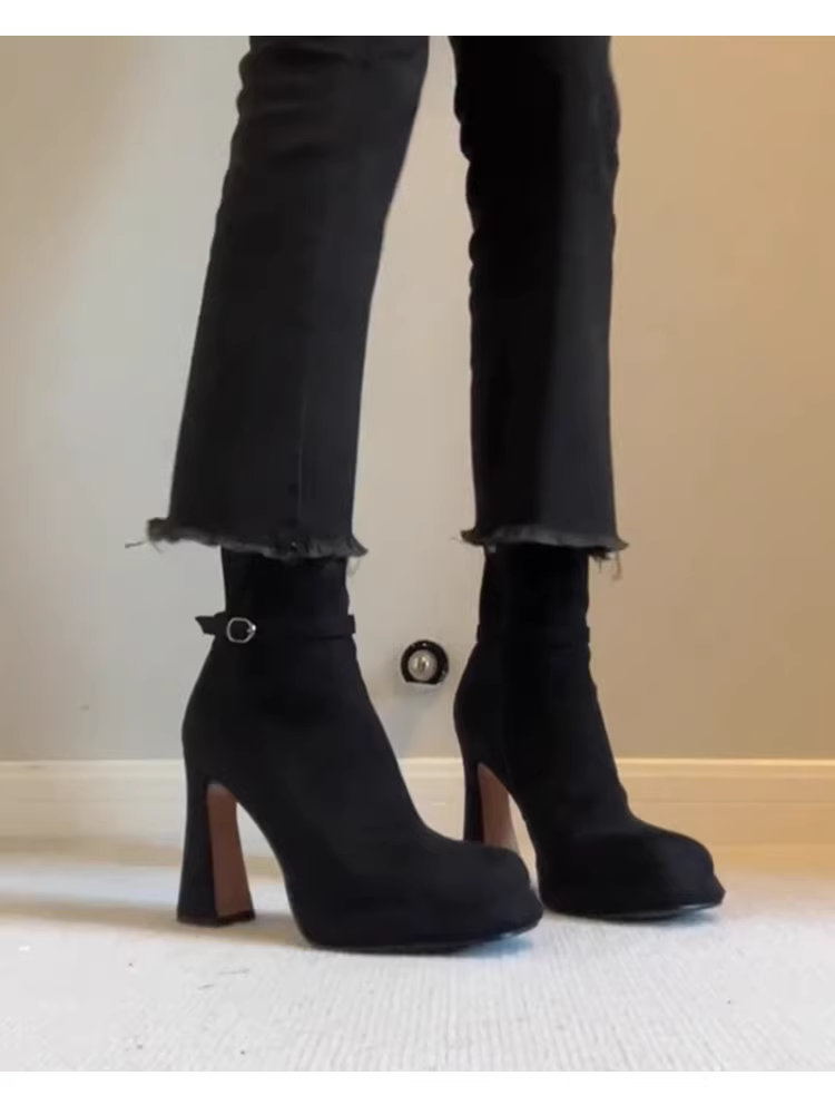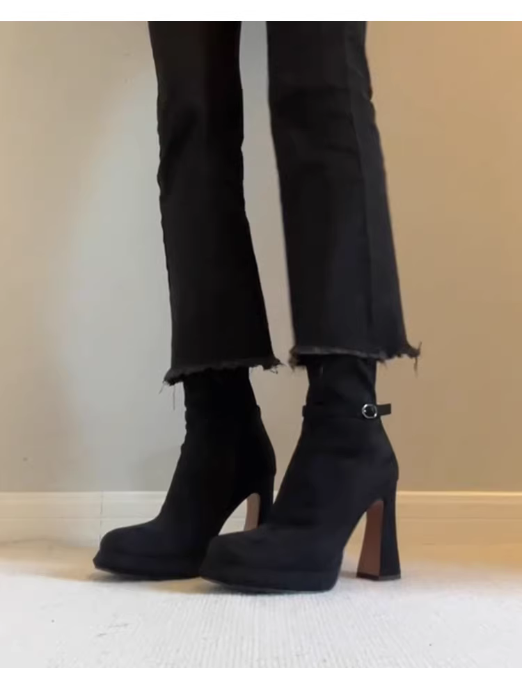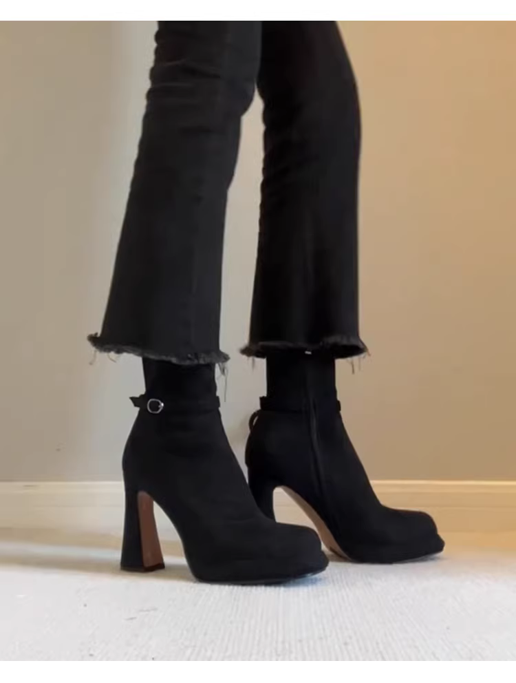 Giày bốt cao gót da lộn mịn kiểu Anh cổ điển, mũi tròn, khóa kéo bên, gót dày, kiểu dáng thon gọn dành cho nữ