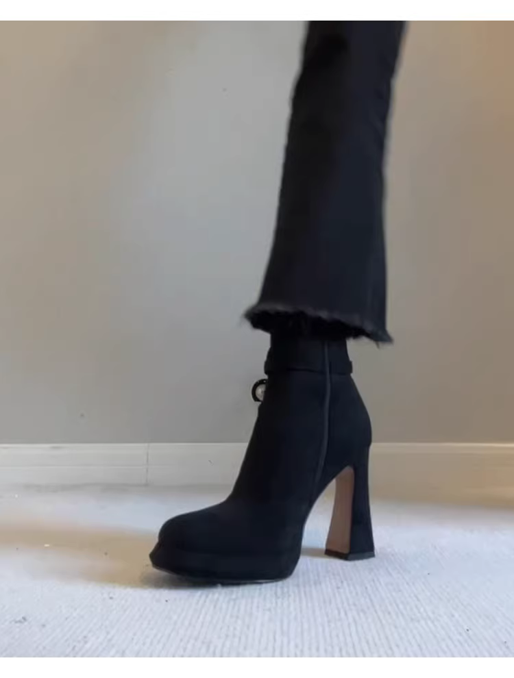 - Giày bốt cao gót da lộn mịn kiểu Anh cổ điển, mũi tròn, khóa kéo bên, gót dày, kiểu dáng thon gọn dành cho nữ