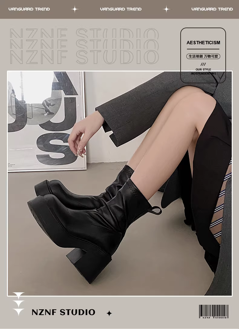 Giày bốt cao gót đế dày, gót thô, kiểu dáng nhỏ nhắn màu đen dành cho nữ, mẫu mới thu đông 2025, kiểu dáng cổ điển, tôn dáng.