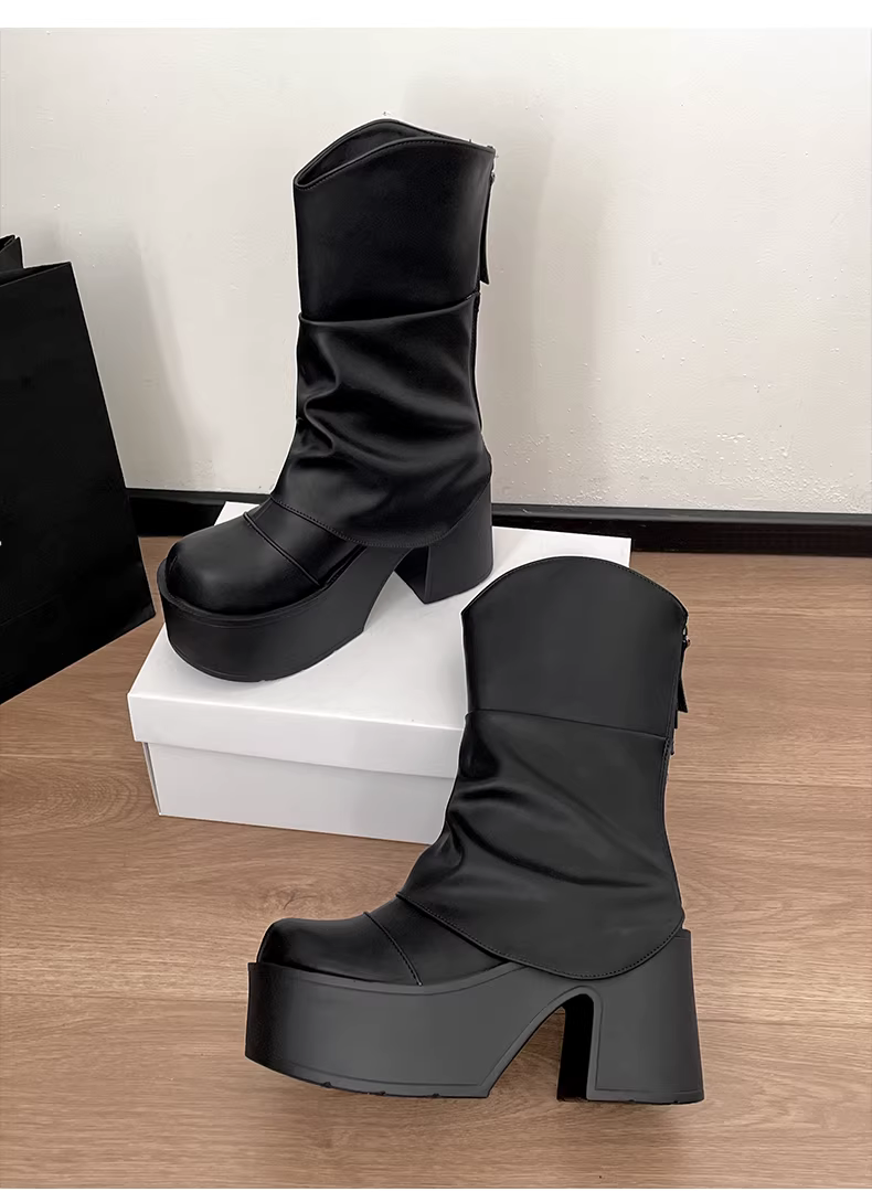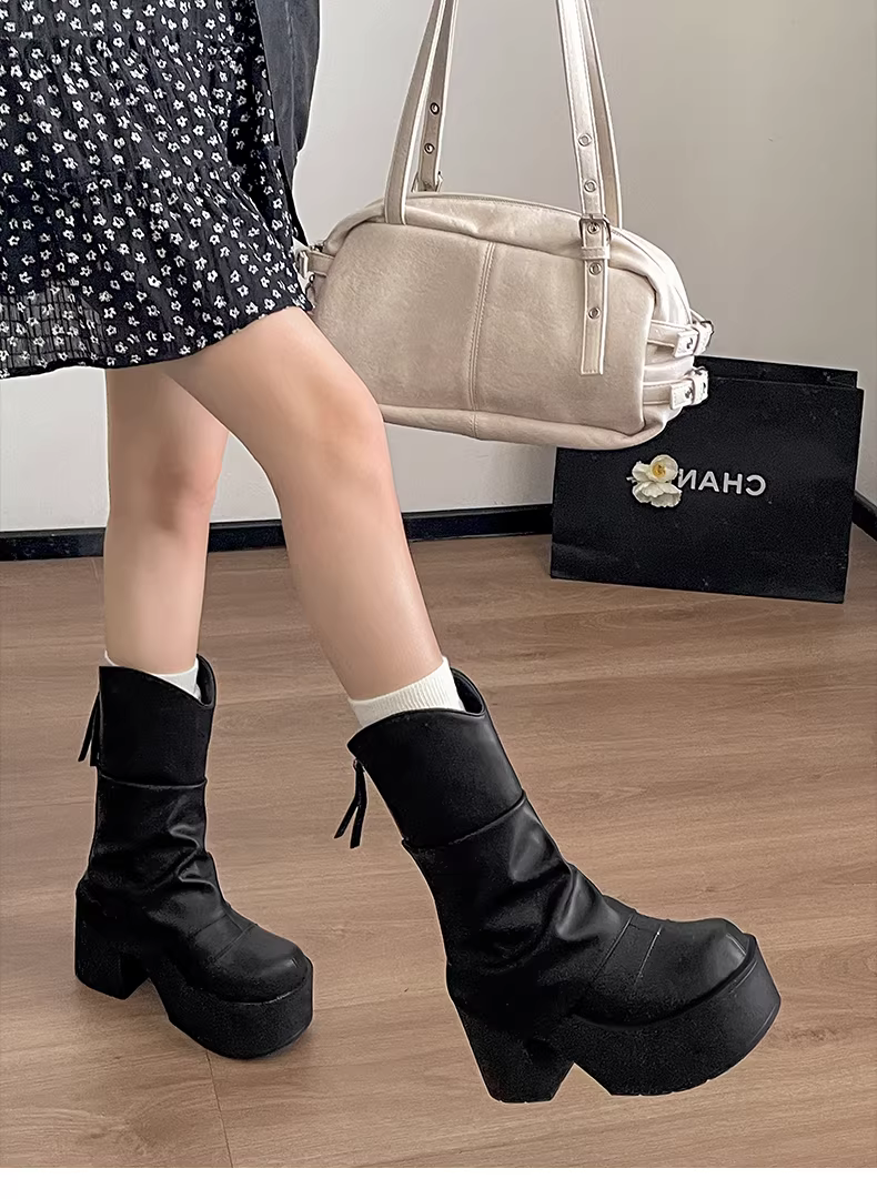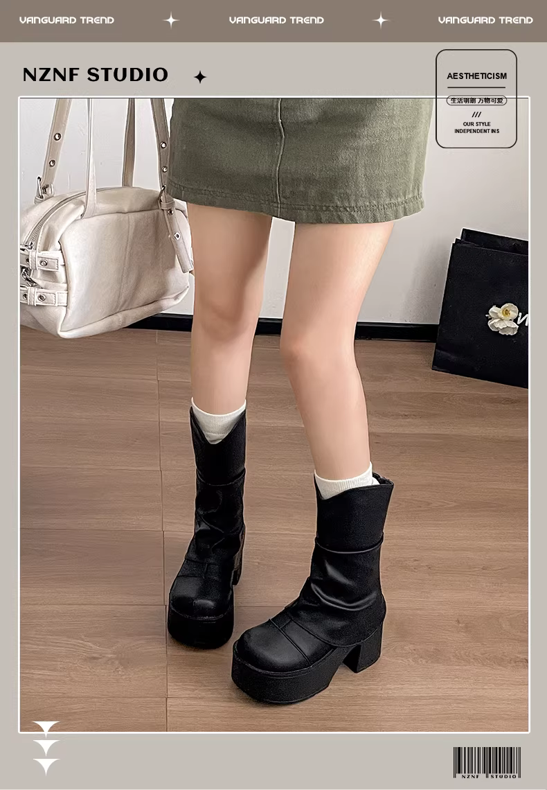 Giày bốt cao gót đế dày kiểu Anh đen dành cho nữ, mẫu mới thu đông 2025, tăng chiều cao và thon gọn đến giữa bắp chân.