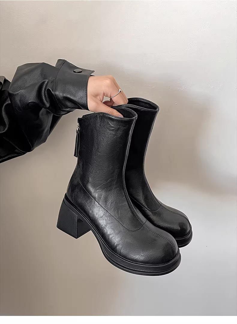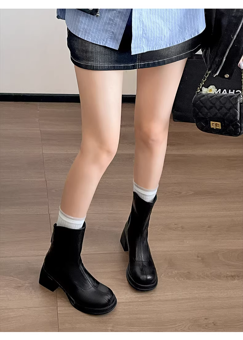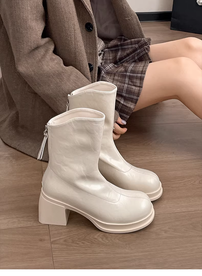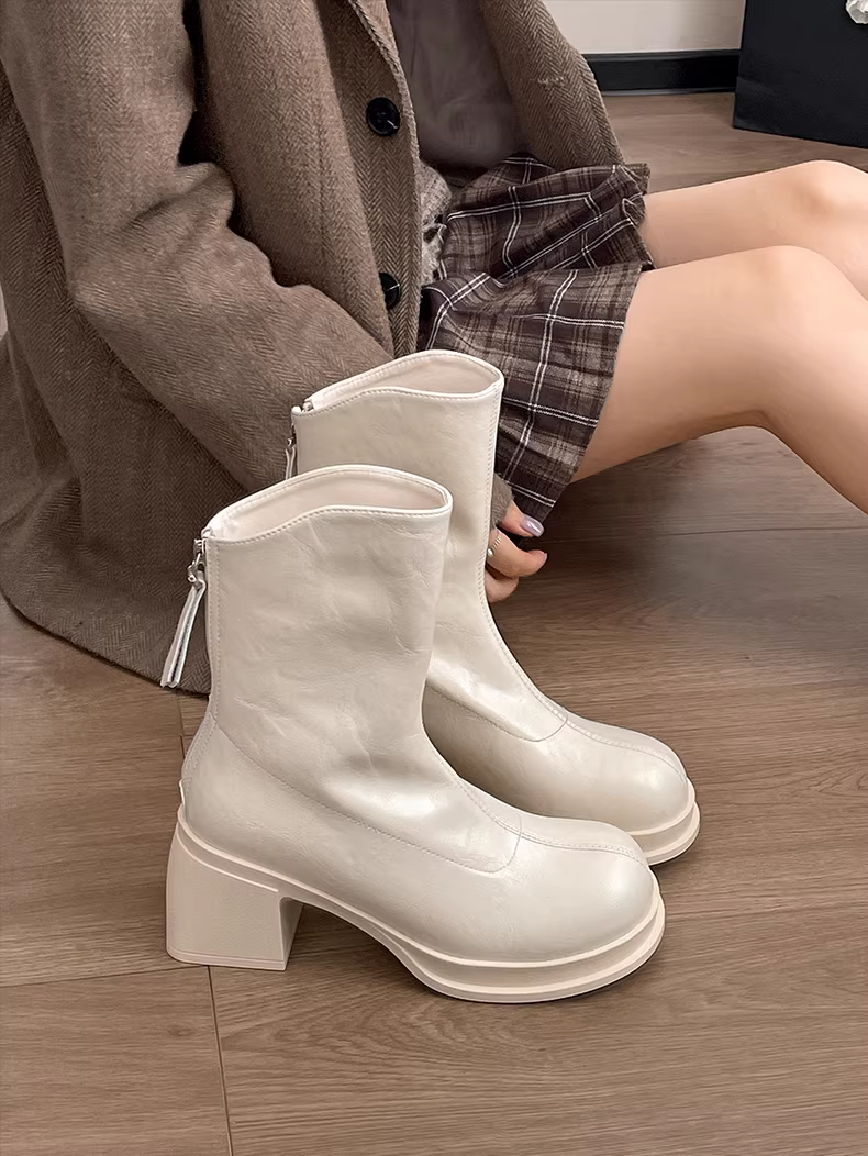 Giày bốt cao gót đế thô kiểu Anh màu trắng dành cho nữ, phong cách retro thu đông 2025, phối cùng chân váy giúp bạn trông thon gọn hơn.