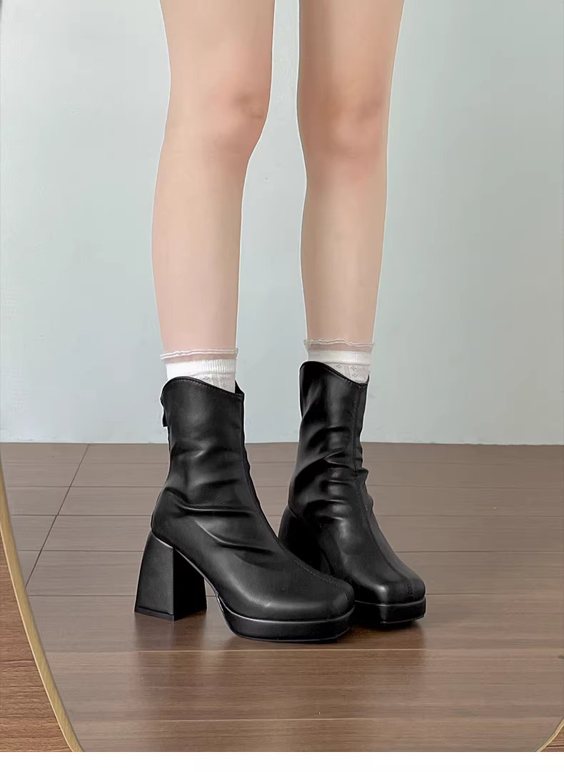 - Giày bốt cao gót đen cổ điển dày dặn kiểu Anh dành cho nữ, mẫu mới thu đông 2025, phối chân váy, kiểu dáng thon gọn, lót lông cừu, bốt ngắn