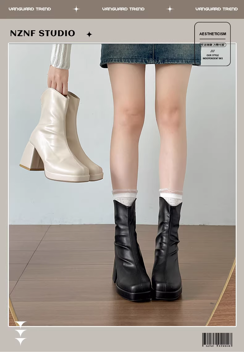 Giày bốt cao gót đen cổ điển dày dặn kiểu Anh dành cho nữ, mẫu mới thu đông 2025, phối chân váy, kiểu dáng thon gọn, lót lông cừu, bốt ngắn