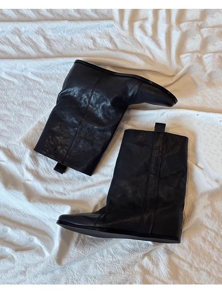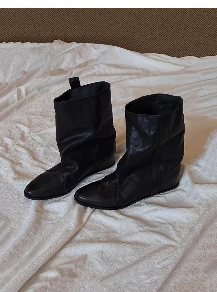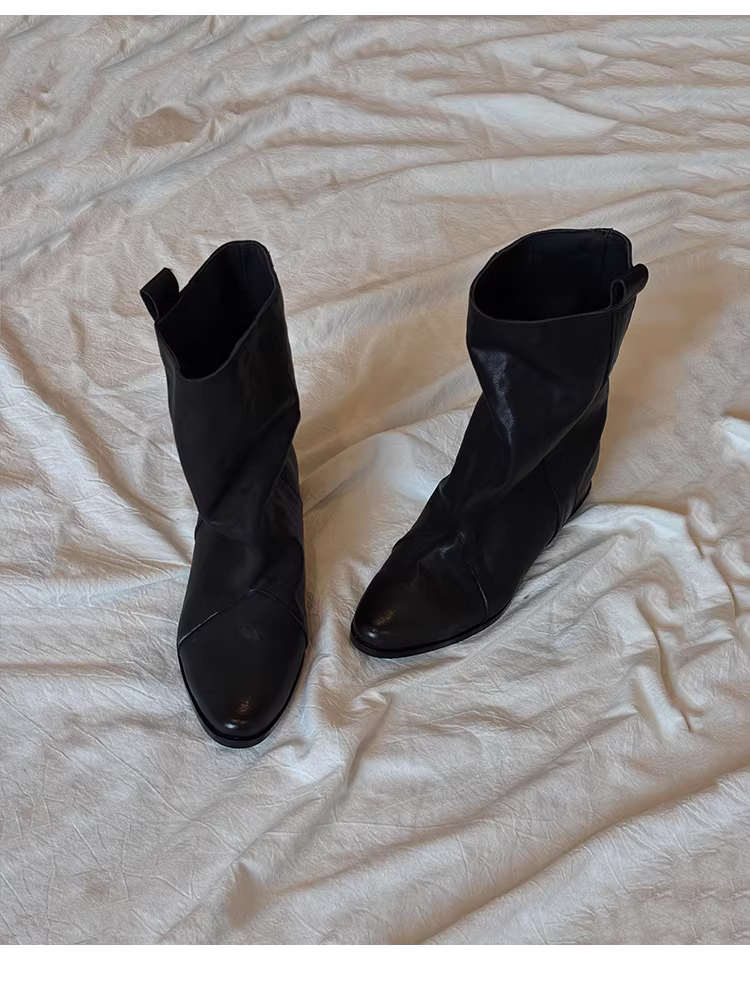 Giày bốt cao gót kiểu dáng đa năng màu đen bằng da bò dành cho nữ, kiểu dáng cổ điển đơn giản, da thật, xếp ly, kiểu dáng đa năng.