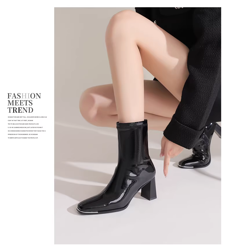 Giày bốt cao gót ngắn Daphne dành cho nữ 2025, mẫu mới thu đông, bốt đơn màu đen, gót dày, kiểu dáng thon gọn, bốt da bóng Kendall dành cho nữ