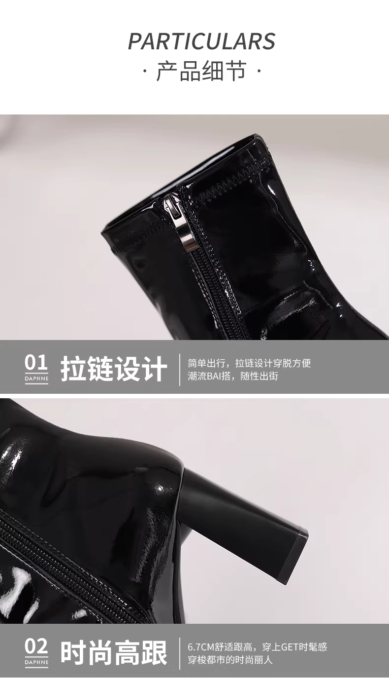 - Giày bốt cao gót ngắn Daphne dành cho nữ 2025, mẫu mới thu đông, bốt đơn màu đen, gót dày, kiểu dáng thon gọn, bốt da bóng Kendall dành cho nữ
