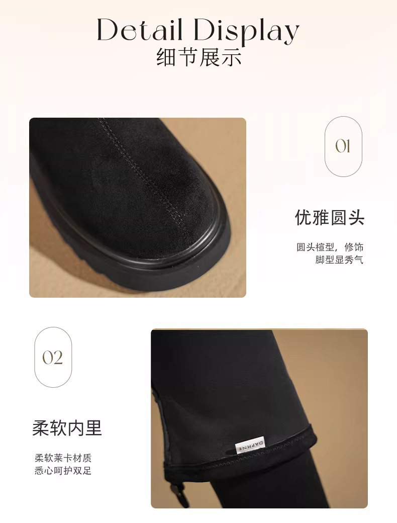 - Giày bốt cao quá gối đế dày Daphne nữ thu đông 2025 kiểu dáng mới tôn dáng, tăng chiều cao, kiểu retro, chất liệu thun co giãn