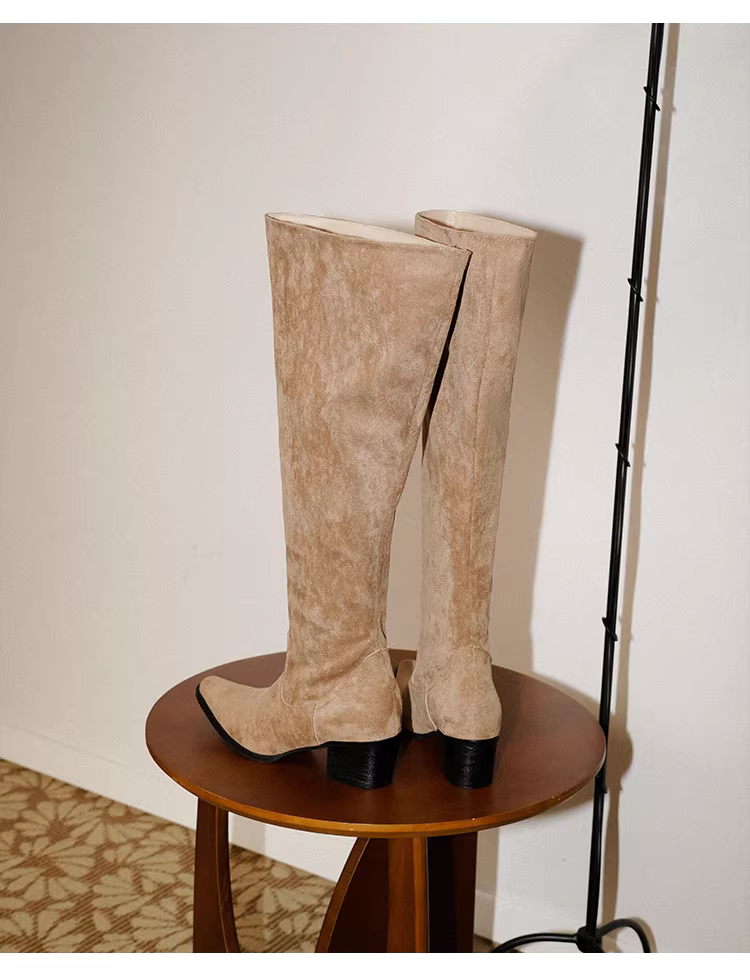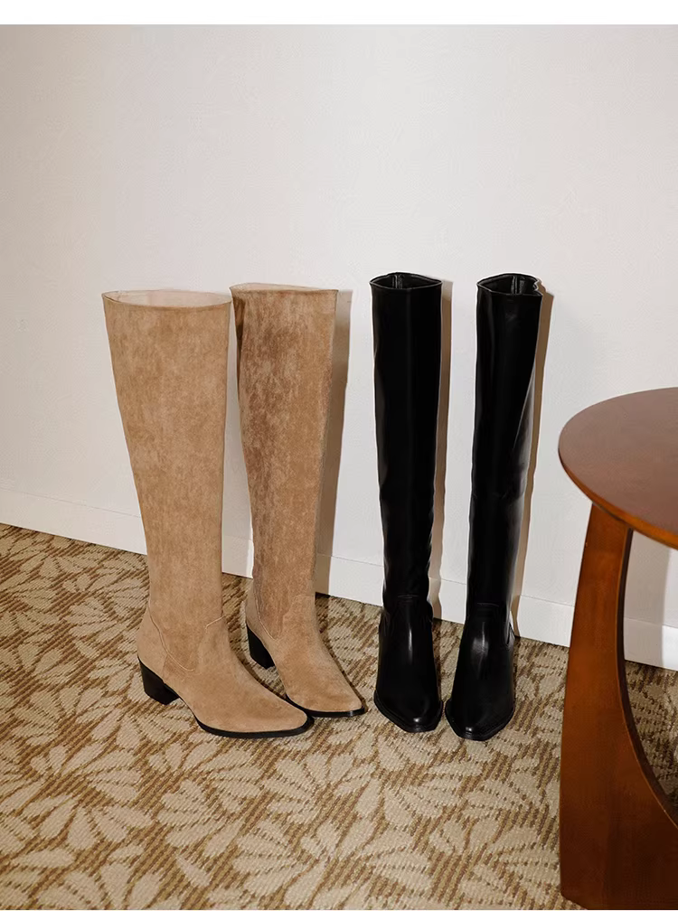 - Giày bốt cao quá gối xếp ly phong cách thoải mái mùa thu đông dành cho nữ, giày bốt kiểu phương Tây đơn giản bằng da thật cổ điển mũi nhọn gót dày