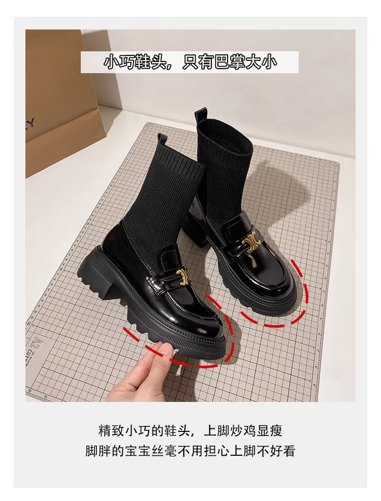 Giày bốt cổ ngắn cho nữ, bốt dệt kim co giãn, gót dày, bốt cổ ngắn đế dày, bốt kiểu Anh dáng thon gọn, bốt Martin tăng chiều cao và thon gọn dành cho người nhỏ nhắn.