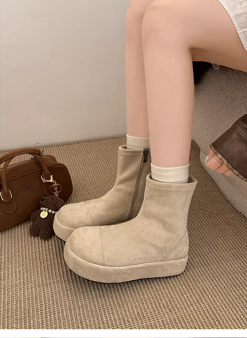 Giày bốt cổ ngắn đế dày, mũi tròn, màu trắng, giúp thon gọn dáng người dành cho nữ, mẫu mới thu đông 2025, đa năng, tăng chiều cao, kiểu dáng Martin.