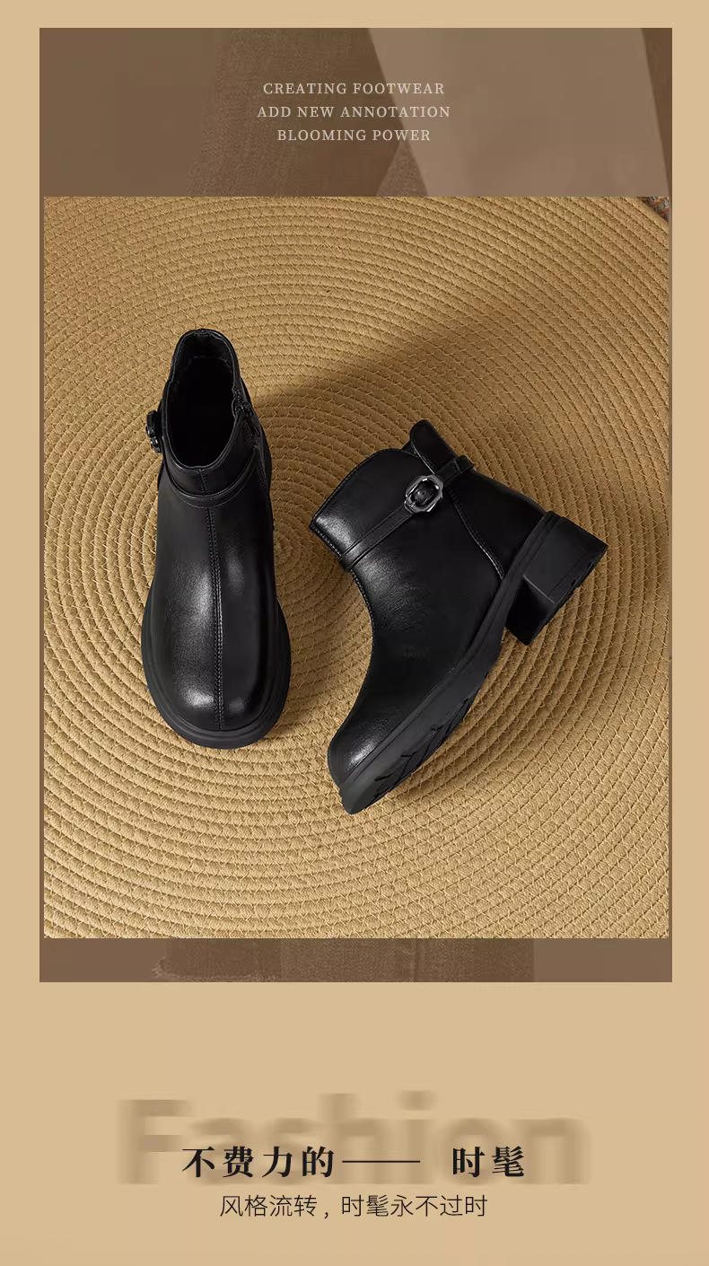 - Giày bốt cổ ngắn đế thô Dadong dành cho nữ, mẫu mới thu đông 2025, màu đen, thời trang, đế mềm, giày mẹ, giày da nữ