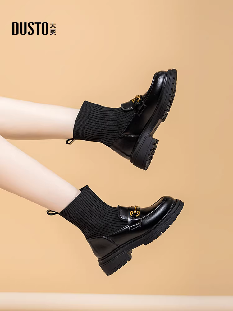 - Giày bốt cổ thấp Dadong Loafer nữ 2025 kiểu Anh mới mùa thu màu đen đế dày lót lông mềm kiểu dáng ôm chân giày da nhỏ