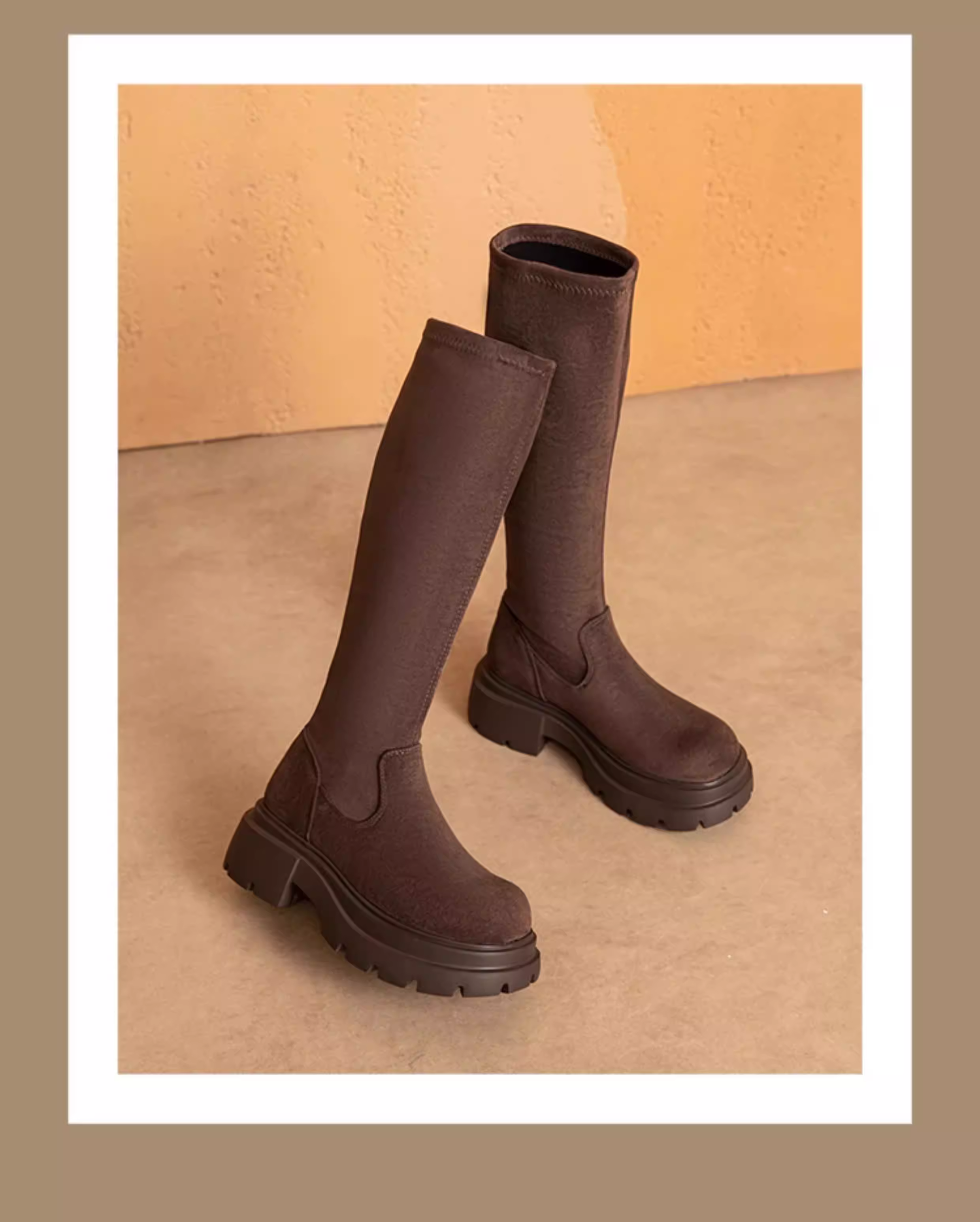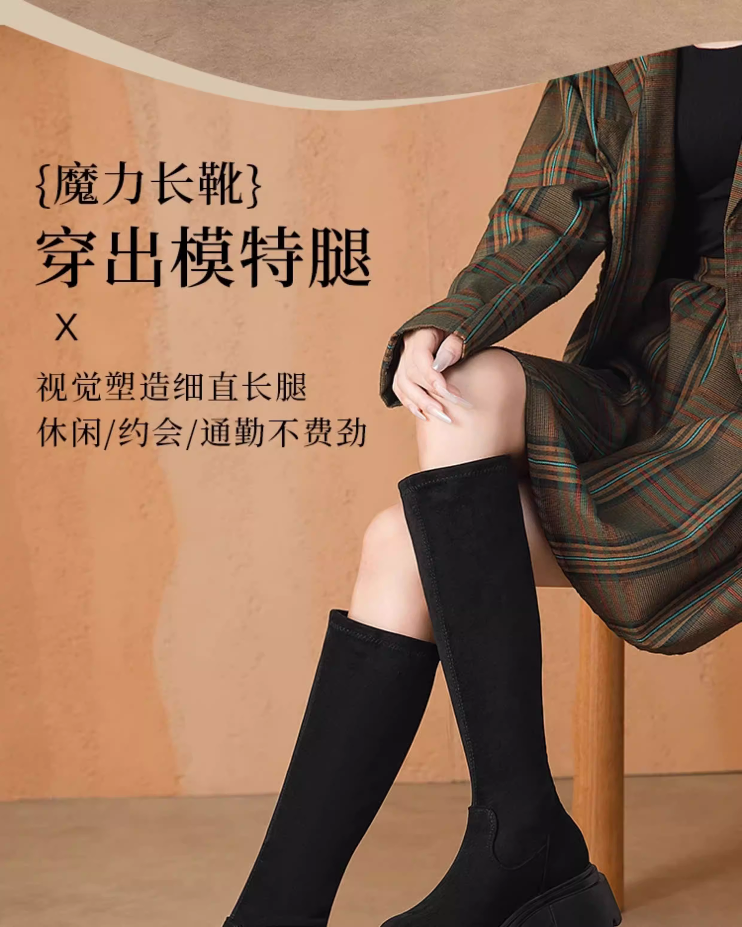 - Giày bốt da lộn Dadong nữ, mẫu mới thu đông 2025, đế dày co giãn ôm dáng, bốt cao cổ màu đen tôn dáng.