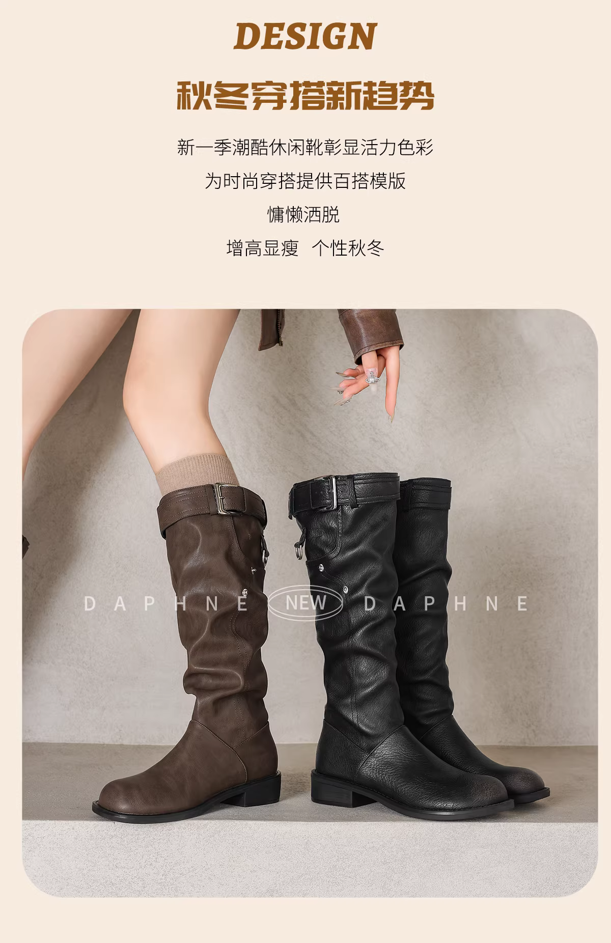 - Giày bốt dài Daphne màu nâu dành cho nữ 2025 mới mùa thu đông lót lông cừu giày bốt dài màu đen giày bốt cưỡi ngựa giày bốt dài