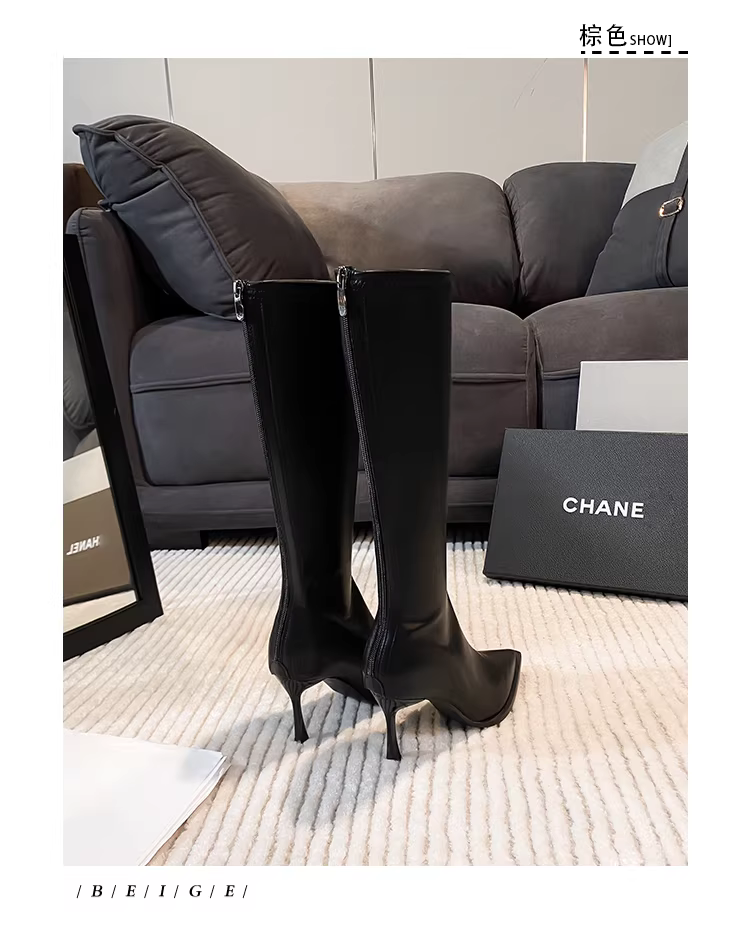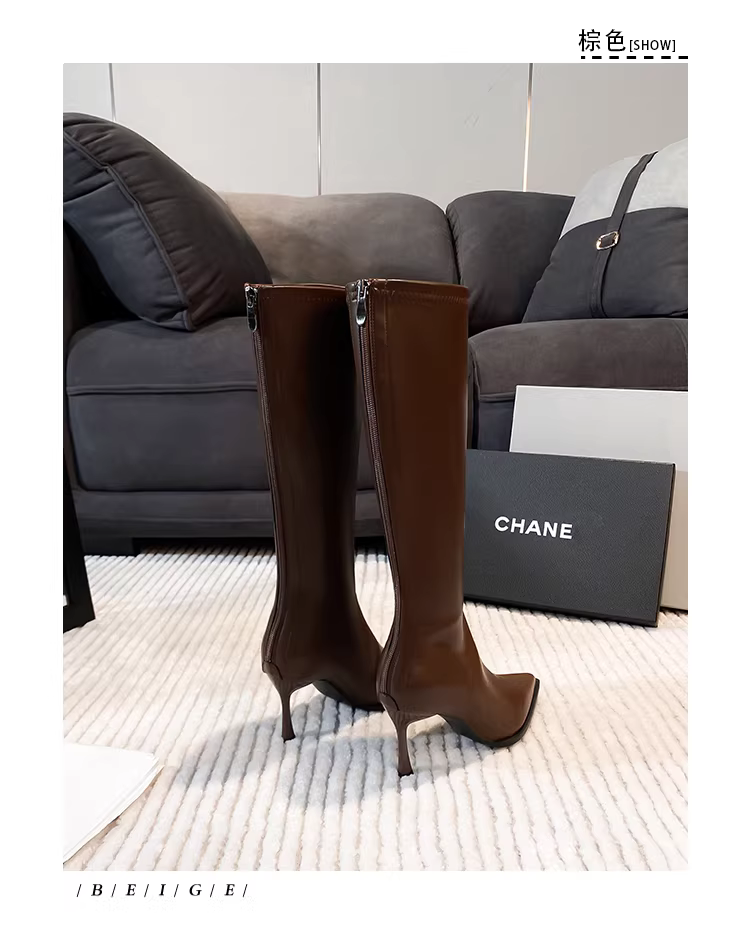 - Giày bốt dài mũi nhọn hình quả lê dành cho nữ, cao gót, màu nâu, dưới đầu gối, dành cho người nhỏ nhắn, co giãn, giày bốt thon gọn, da thật, giày cao gót.