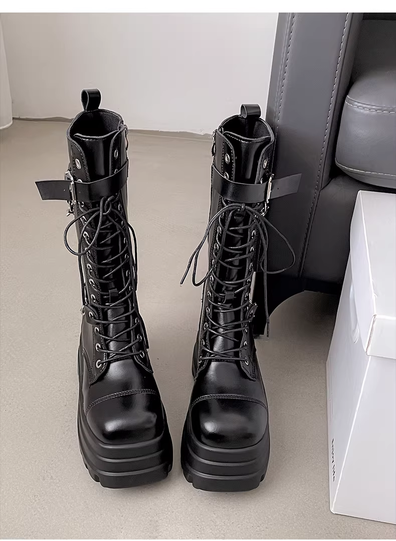 - Giày bốt đế cao phong cách punk đen dành cho phụ nữ nhỏ nhắn, bốt dài, kiểu dáng mới thu đông 2025, kiểu dáng Anh quốc, tôn dáng.