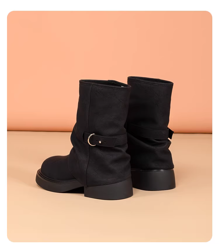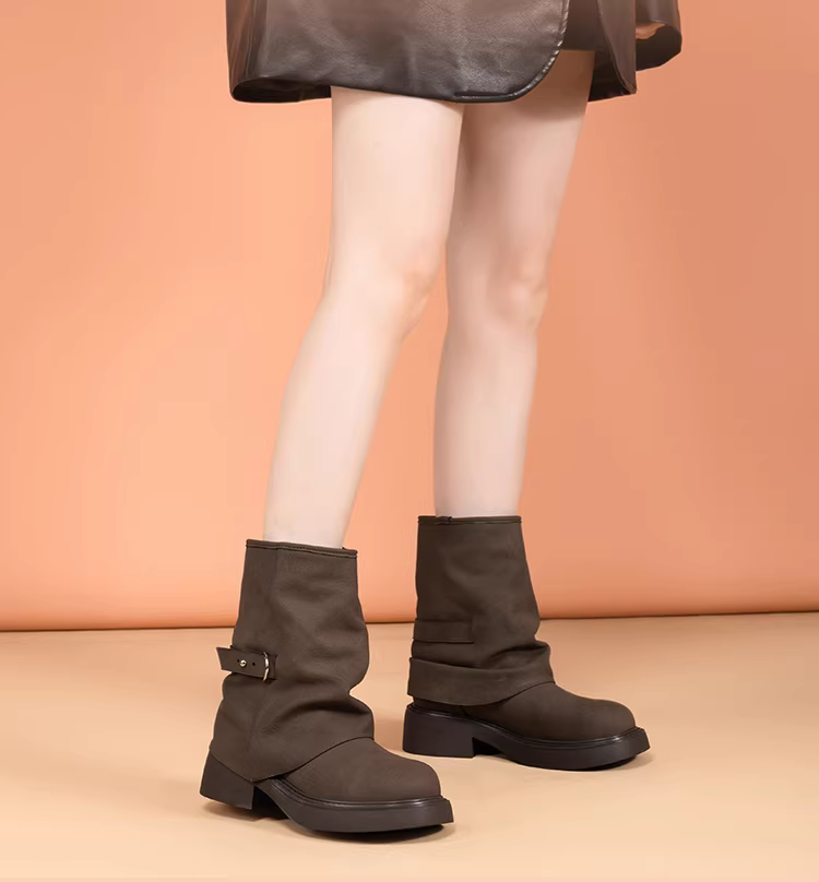- Giày bốt đế dày Dadong dành cho nữ 2025 mới thu đông Giày bốt màu nâu Melard kiểu retro bootcut xếp tầng Giày bốt Martin