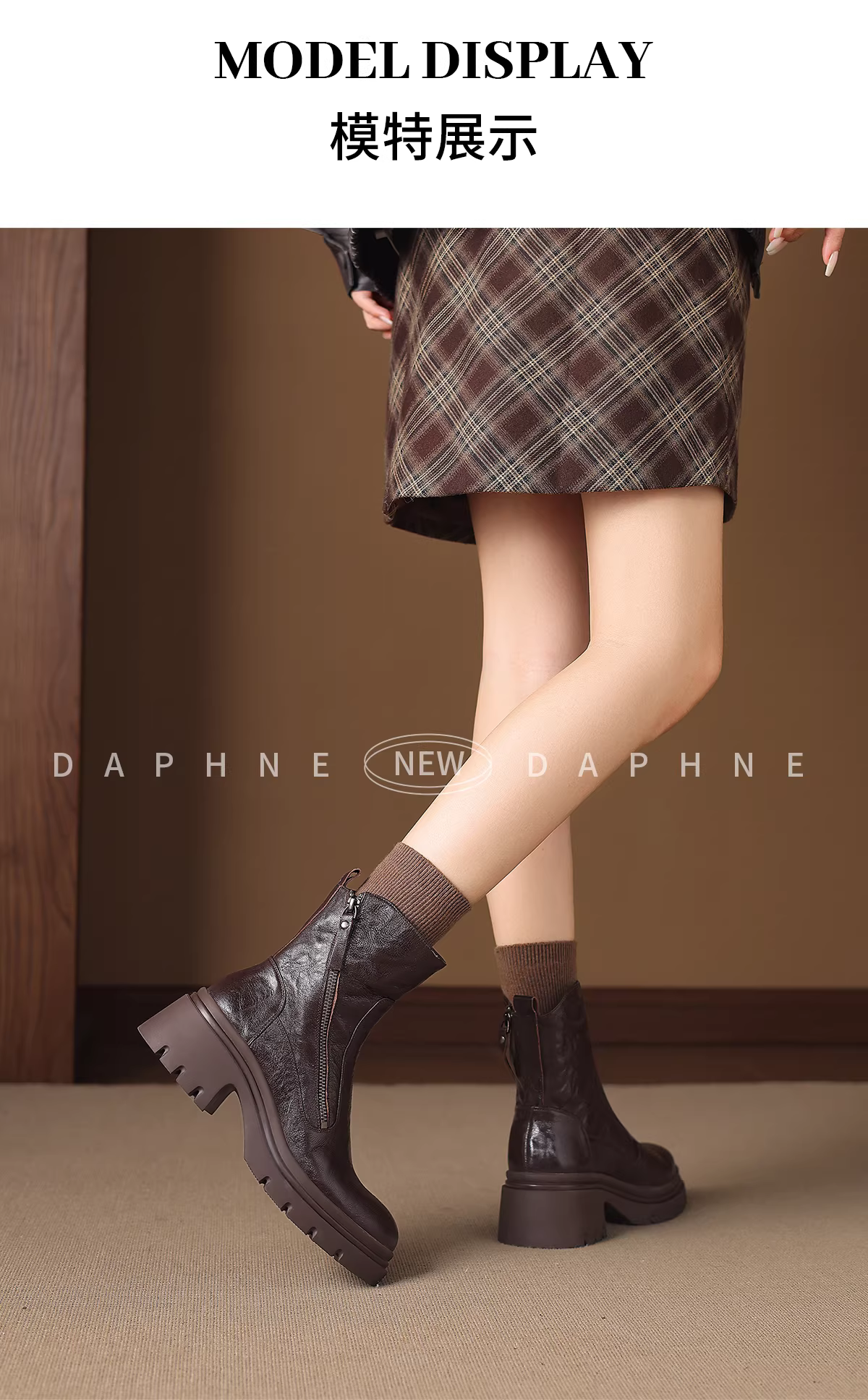 - Giày bốt đế dày Daphne dành cho nữ 2025, kiểu dáng mới mùa đông, màu nâu, kiểu dáng ôm sát, phong cách Anh, chất liệu da, lót lông, kiểu Martin.