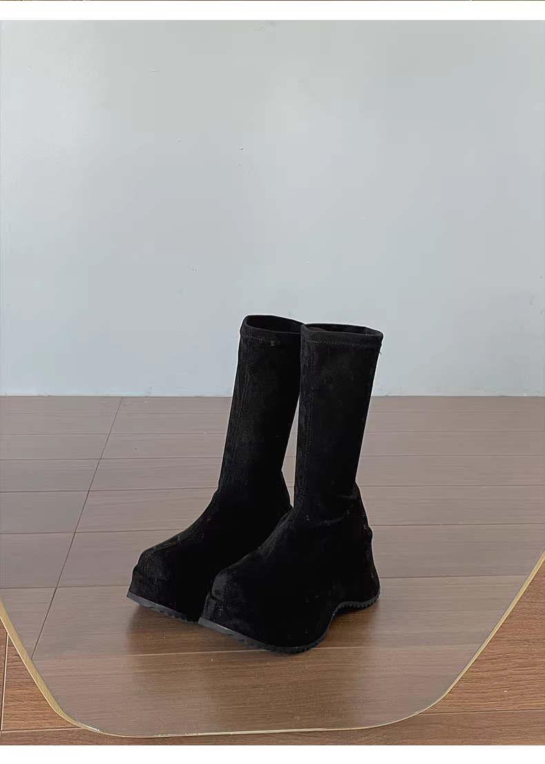Giày bốt đế dày kiểu retro dành cho nữ mùa thu đông 2025, tăng chiều cao, ôm dáng, chất liệu thun co giãn, dành cho người nhỏ nhắn