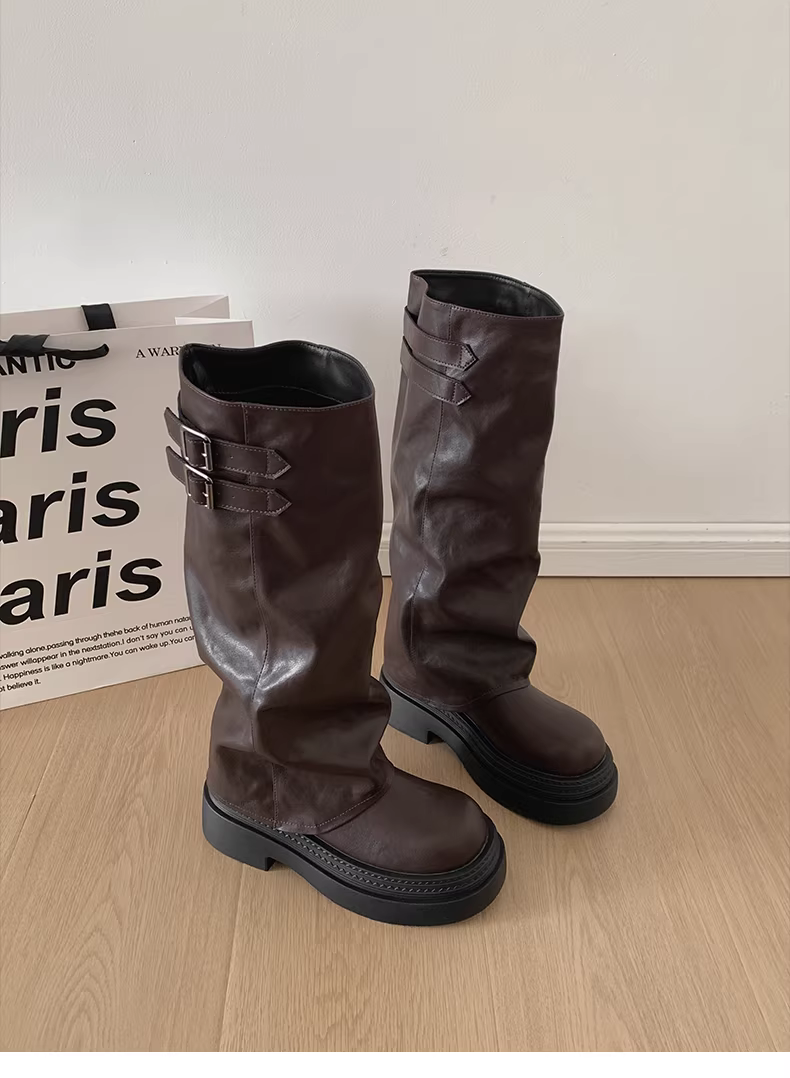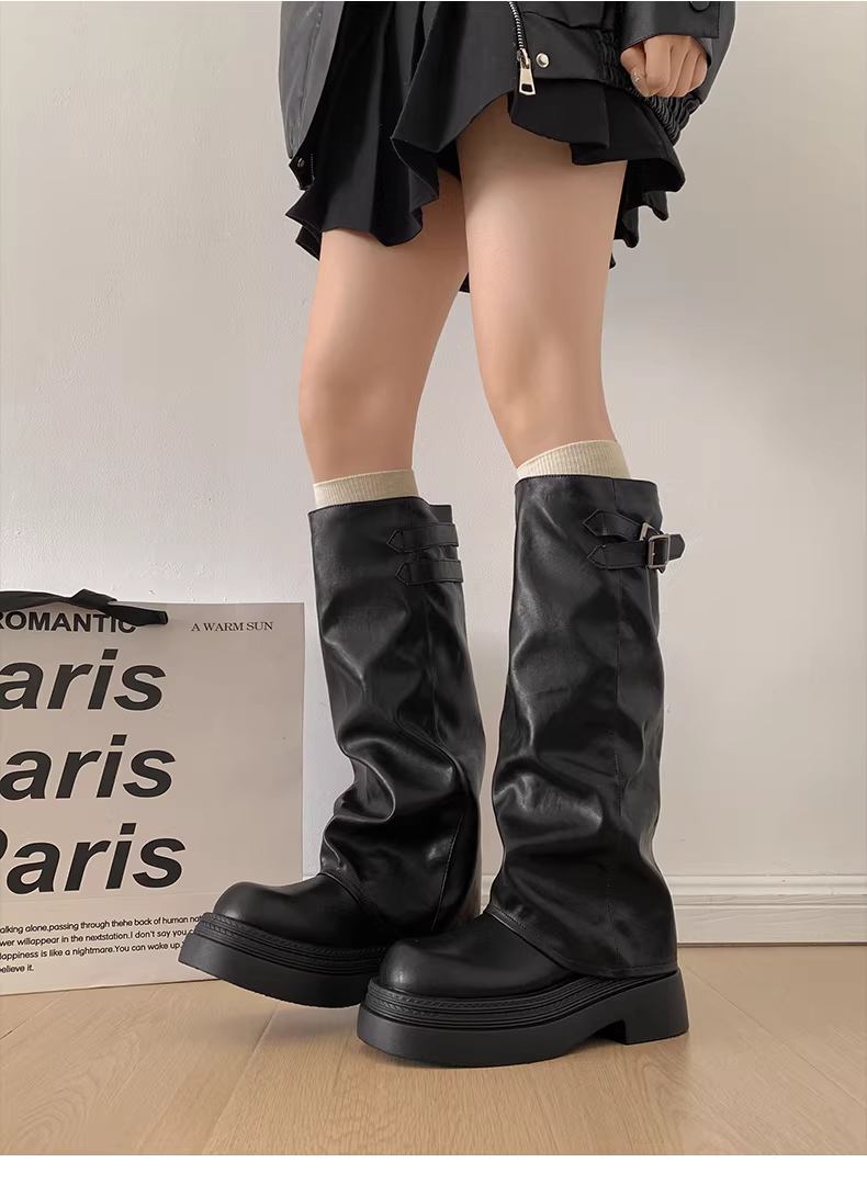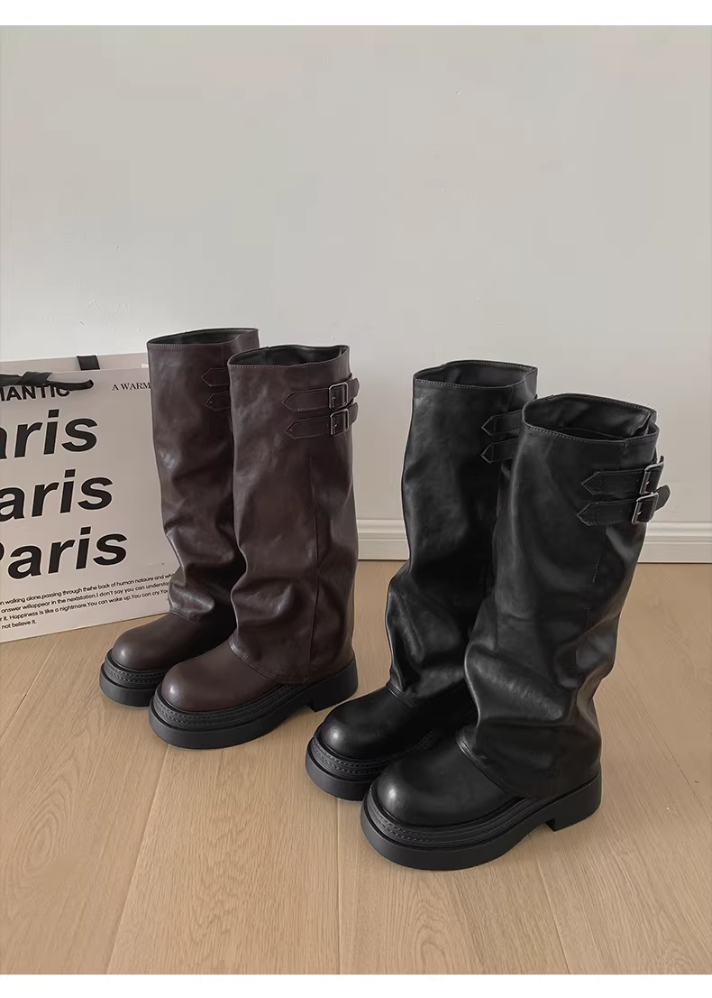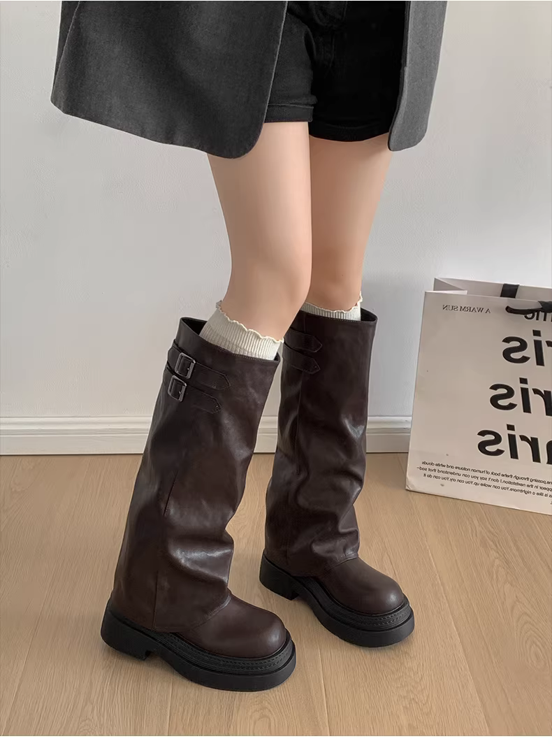 - Giày bốt đế dày màu đen phong cách retro Nam Trung Quốc dành cho nữ, kiểu dáng mới Thu Đông 2025, phối cùng chân váy và giúp thon gọn chân