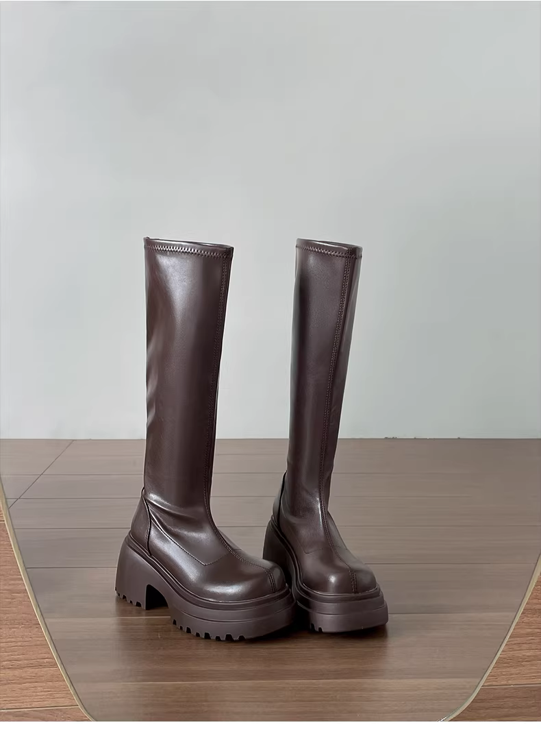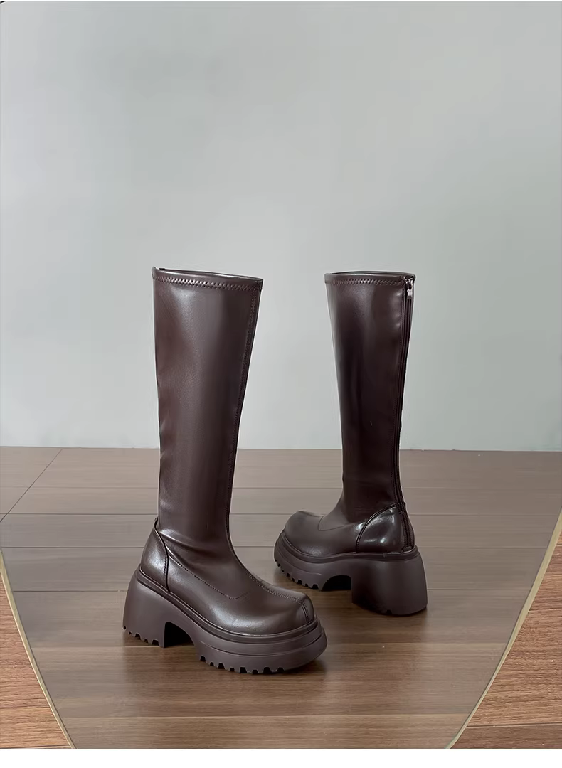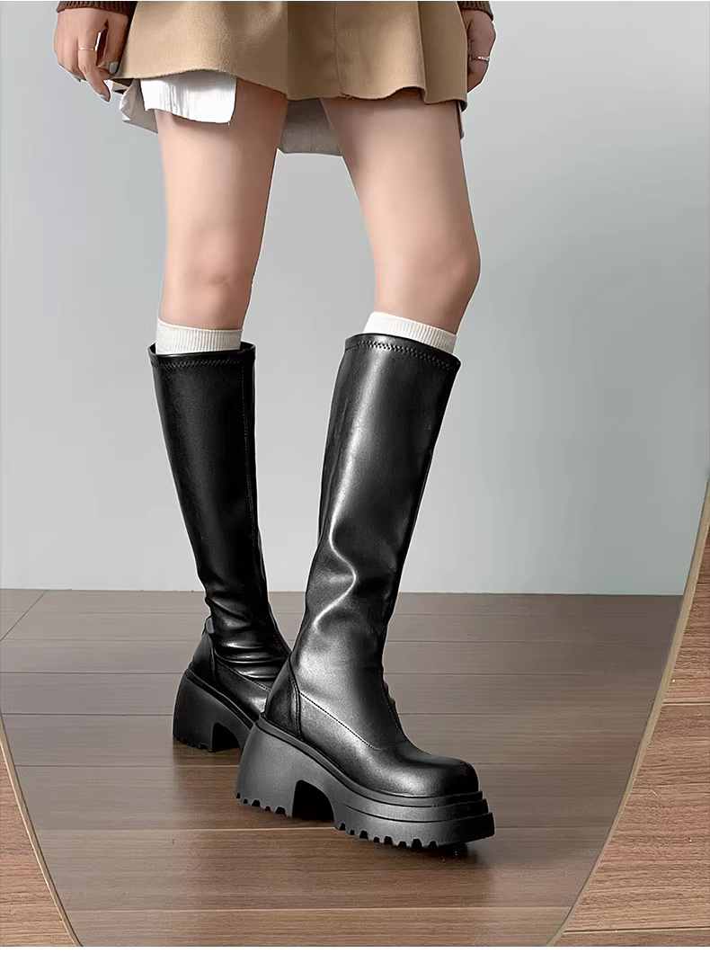 Giày bốt đế xuồng cao cổ kiểu retro đen dành cho nữ, kiểu dáng mới thu đông 2025, phối cùng chân váy, giúp thon gọn và tăng chiều cao.