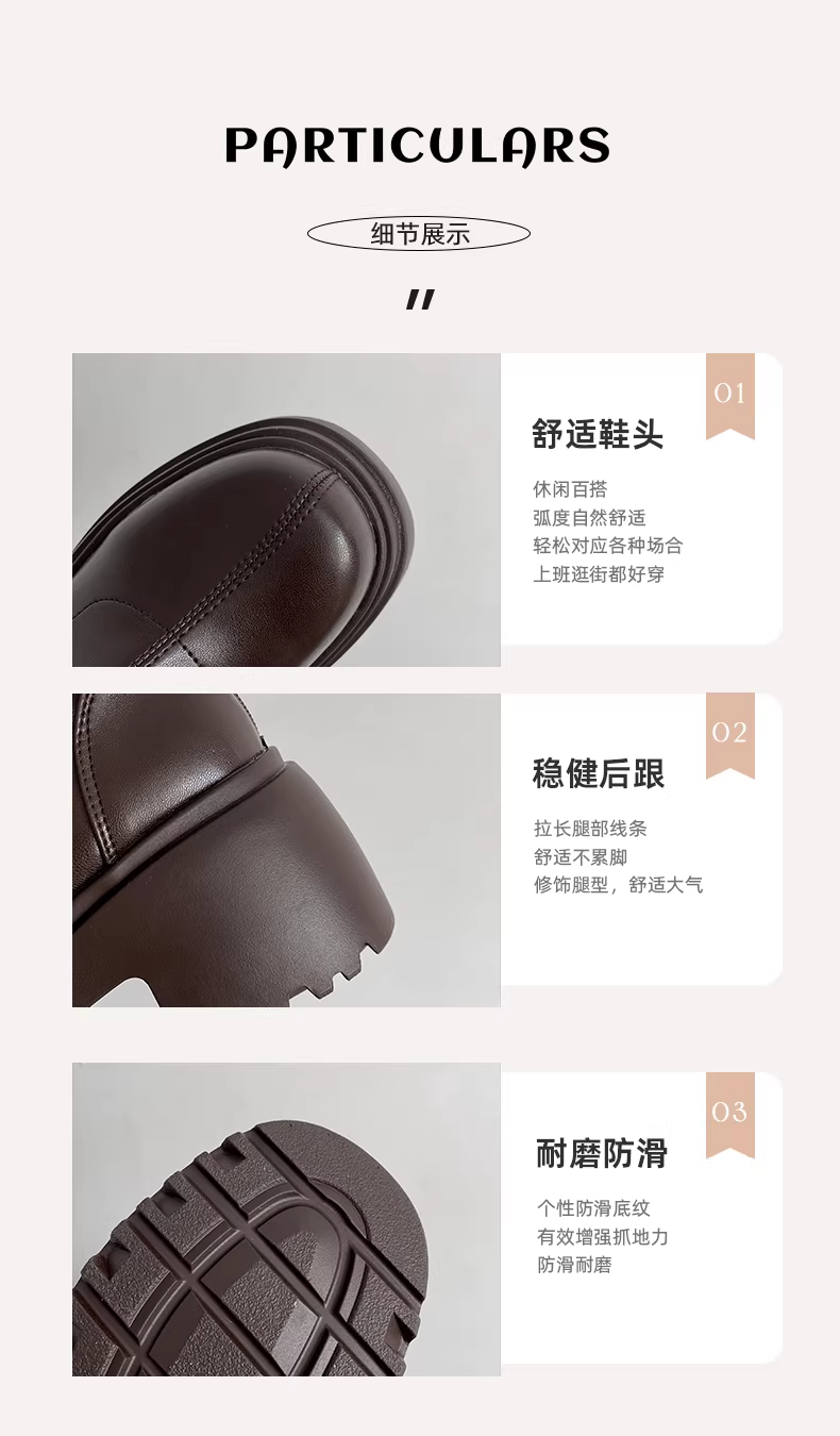 - Giày bốt đế xuồng cao cổ kiểu retro đen dành cho nữ, kiểu dáng mới thu đông 2025, phối cùng chân váy, giúp thon gọn và tăng chiều cao.