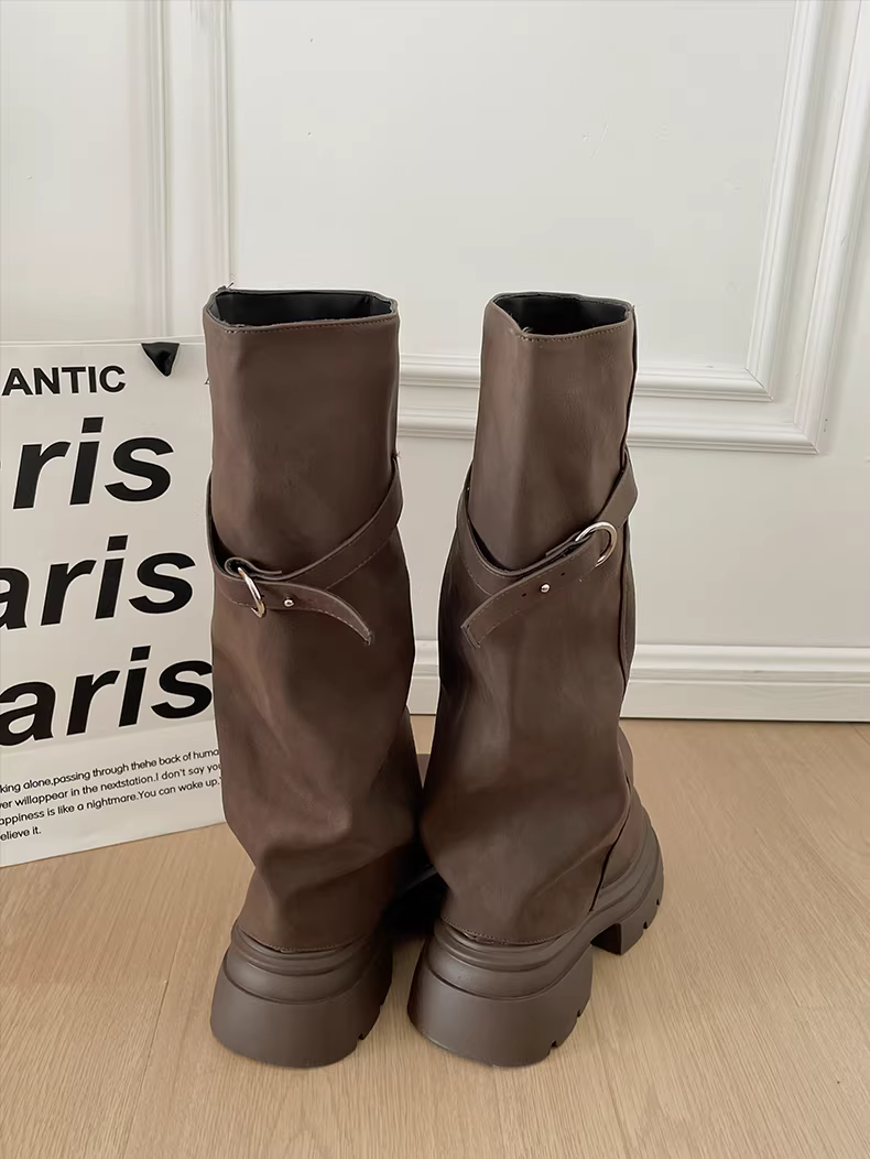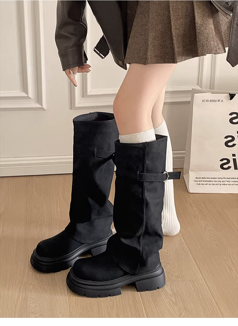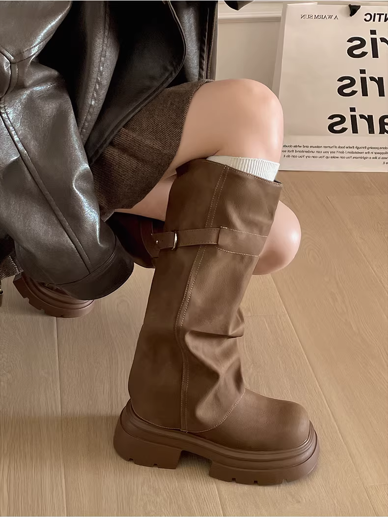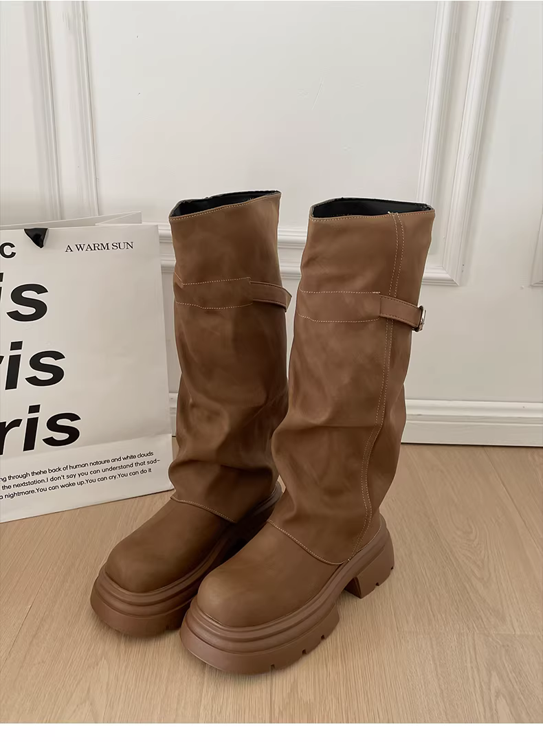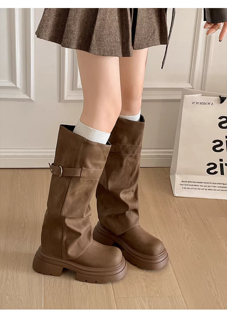 - Giày bốt đế xuồng cao cổ lót lông ấm áp kiểu retro nữ 2025 mới mùa đông đa năng tăng chiều cao tôn dáng