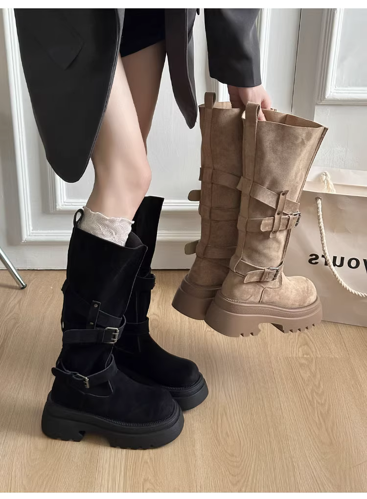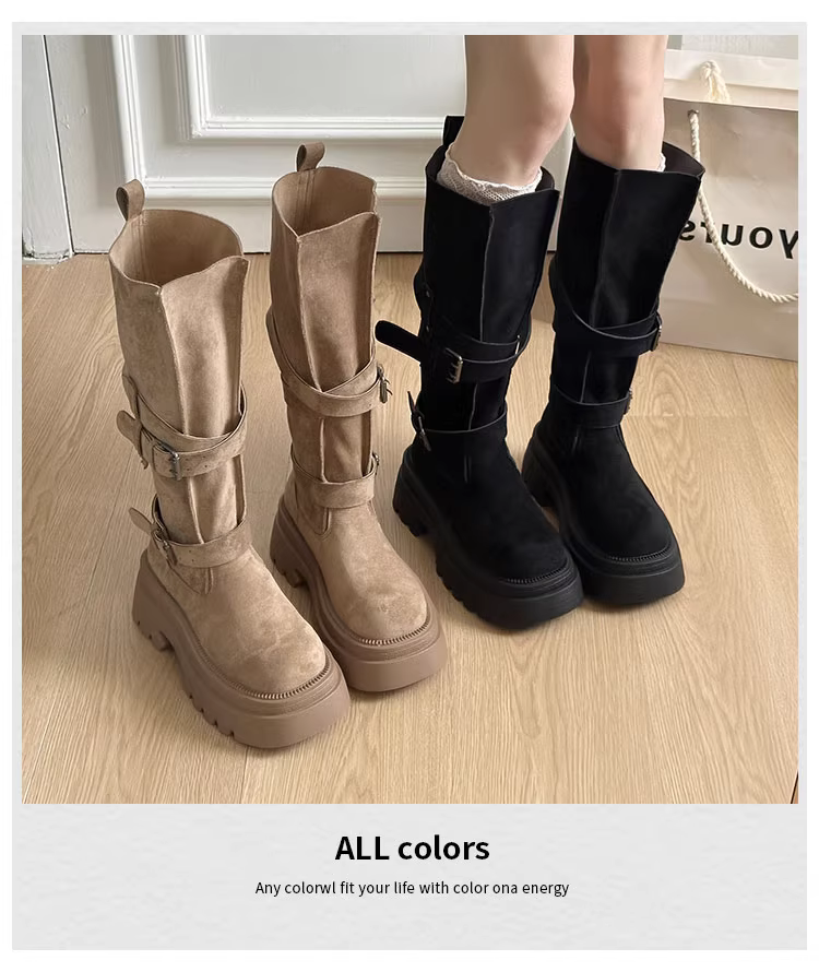 Giày bốt đế xuồng cao cổ màu kaki cổ điển dành cho nữ, kiểu dáng mới mùa thu đông 2025, tăng chiều cao, tôn dáng, kiểu Melard.