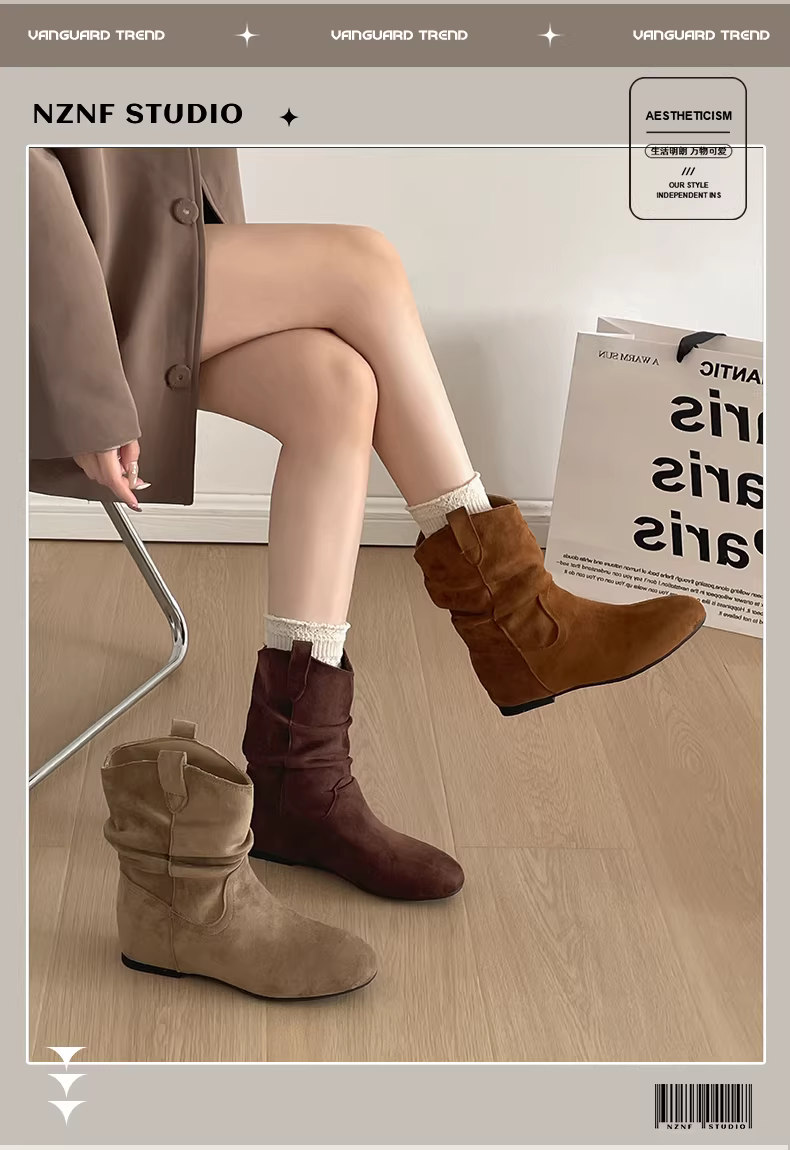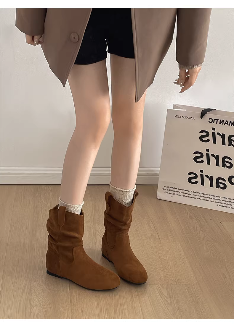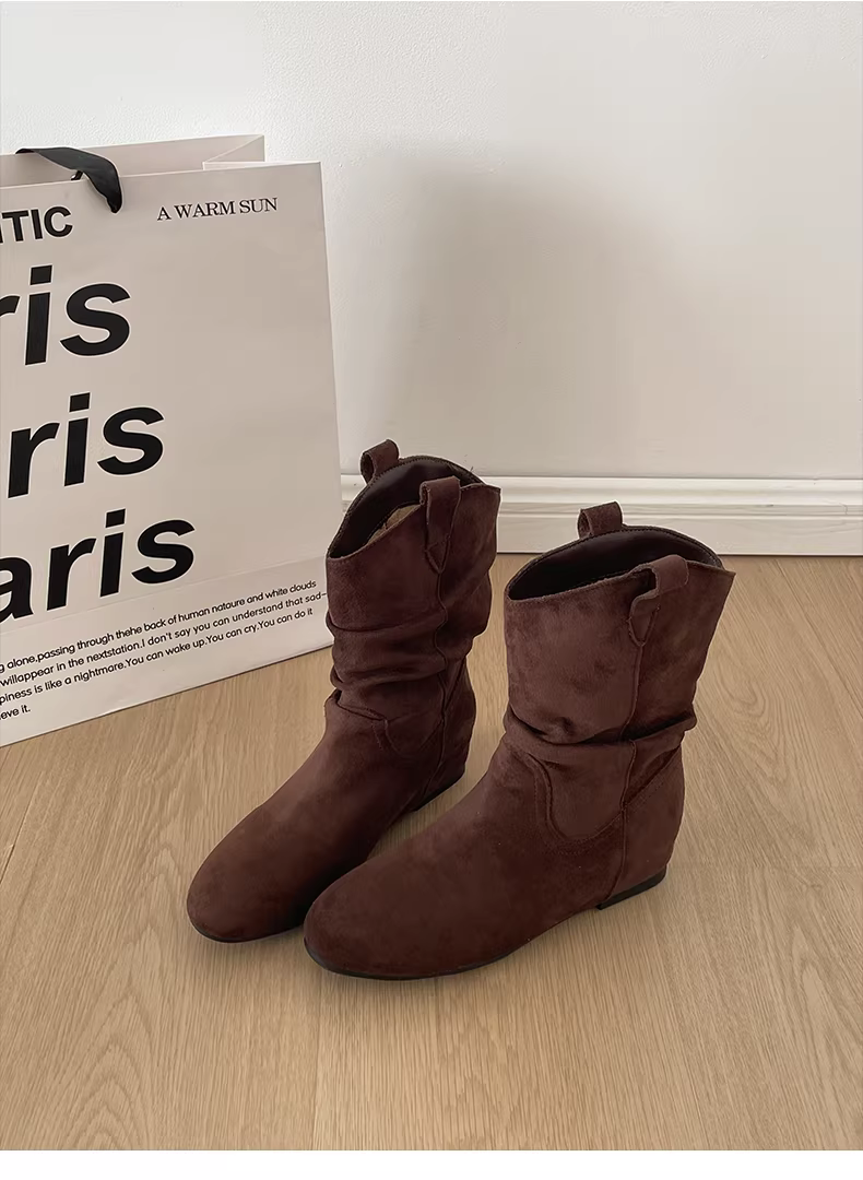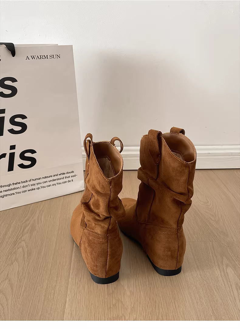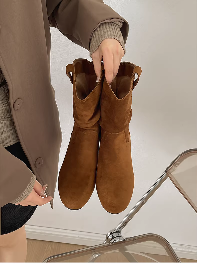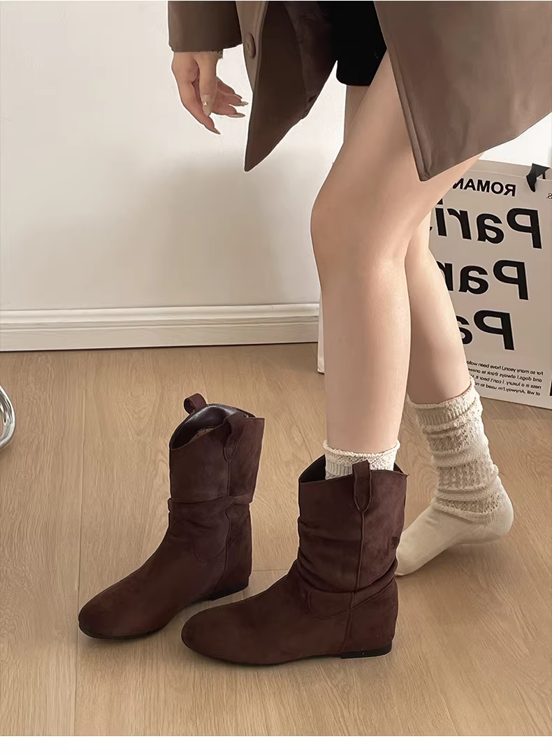 - Giày bốt đế xuồng mũi nhọn kiểu retro màu nâu dành cho nữ, kiểu dáng mới thu đông 2025, phối cùng chân váy, bốt ngắn Melard