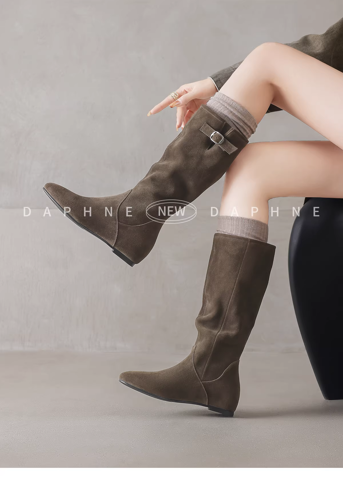 - Giày bốt đen Daphne dành cho nữ 2025, kiểu dáng mới phổ biến, bốt cao cổ kiểu cao bồi miền Tây, chất liệu da lộn, đế bằng, kiểu dáng ôm sát, đế cao.