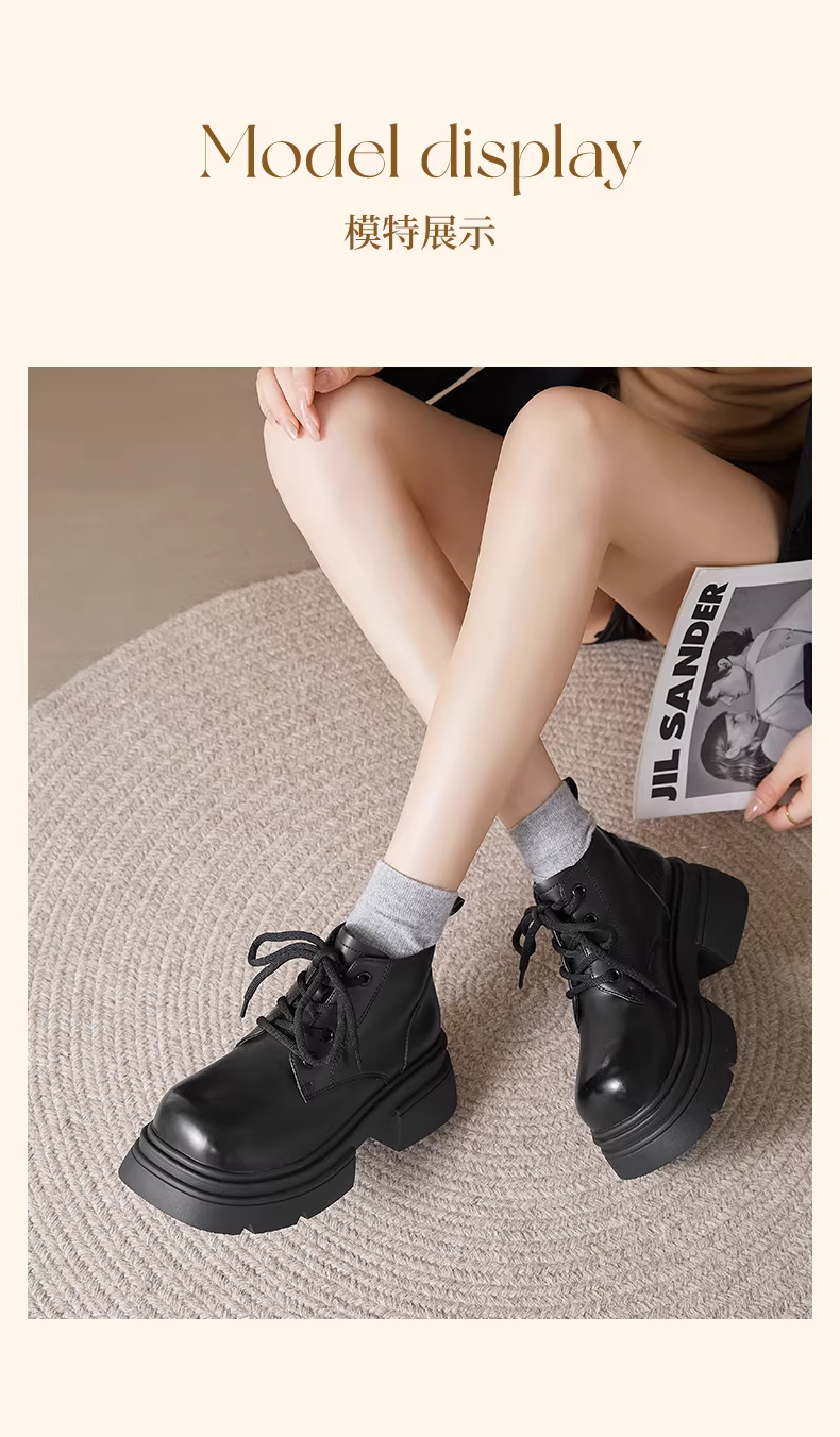 Giày bốt Martin cổ thấp Daphne dành cho nữ 2025, kiểu mới thu đông, lót lông cừu, đế dày, tăng chiều cao, phong cách Anh, chất liệu cotton, màu nâu, kiểu bốt ngắn